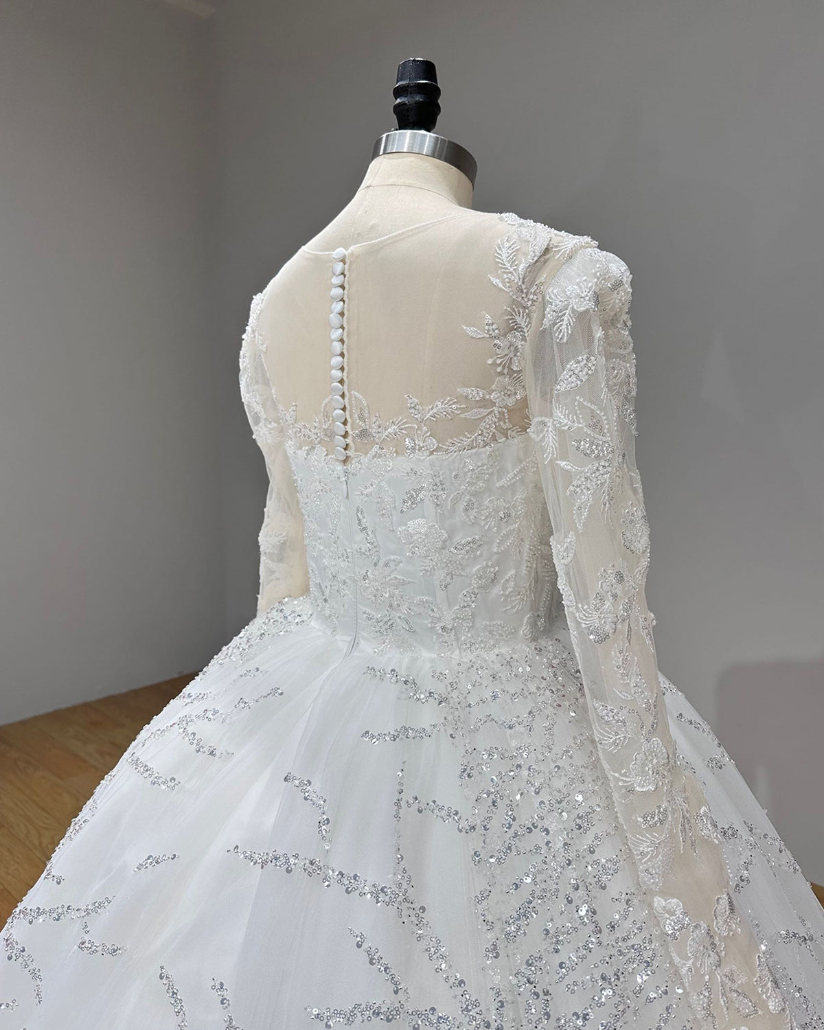 This Beaded Ball Gown Wedding Dress features elegant long sleeves, intricate beadwork, and a striking see-through back. Its voluminous skirt and luxurious design create a timeless, fairytale look for your special day.