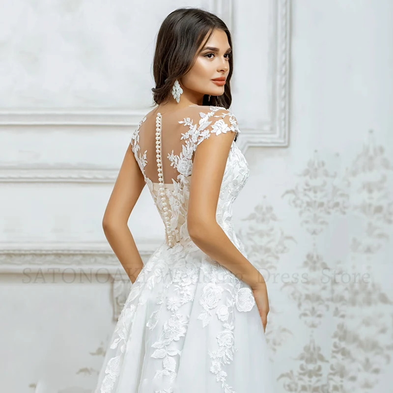 The Elegant Lace Short Wedding Dress with V-neck and cap sleeves features intricate appliques and a knee-length hem, blending timeless elegance with modern style. Lightweight and comfortable, it’s perfect for intimate or outdoor weddings.