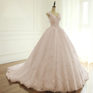 Elegant V Neck Flowers Lace Princess Wedding Dress Luxury A-Line Bridal Gown