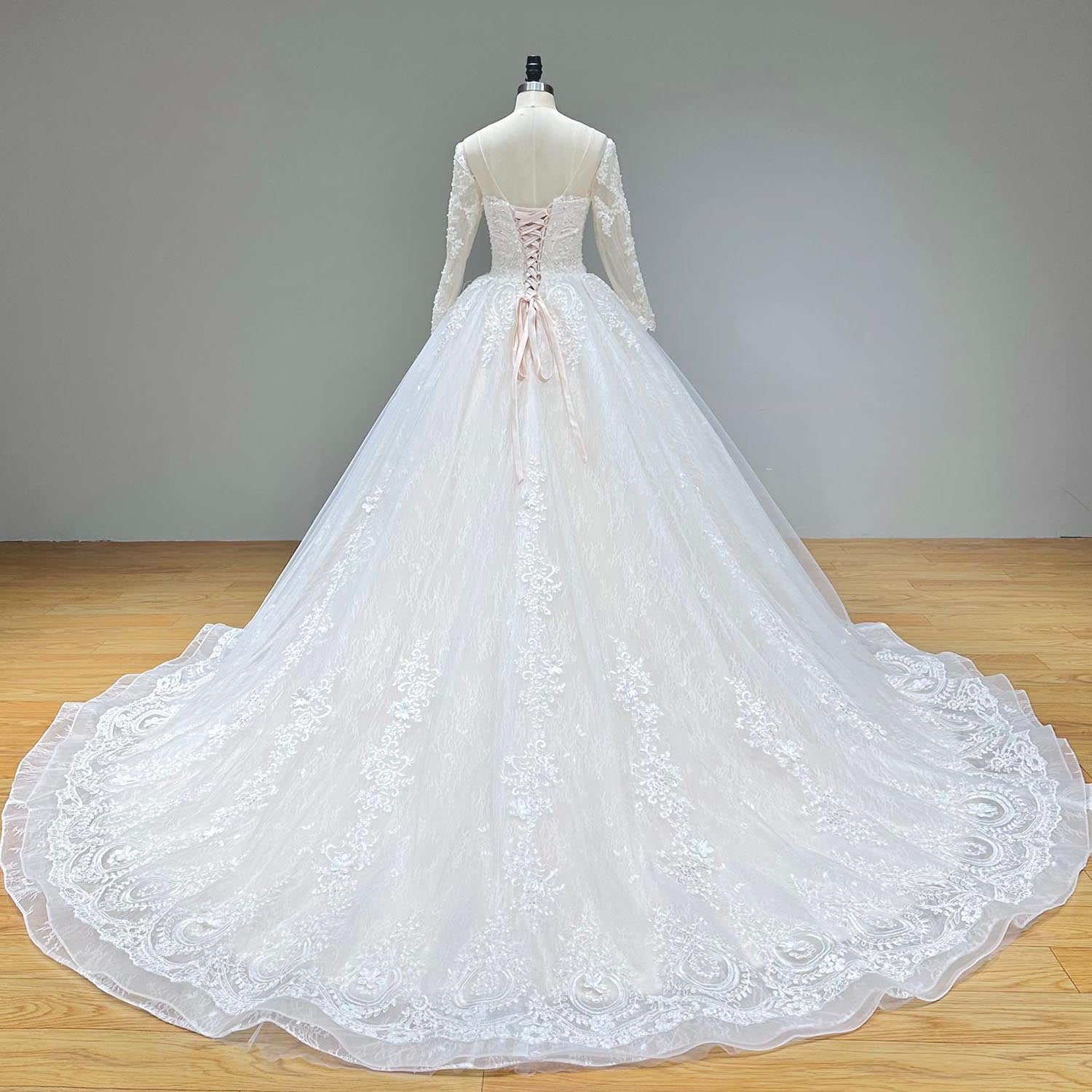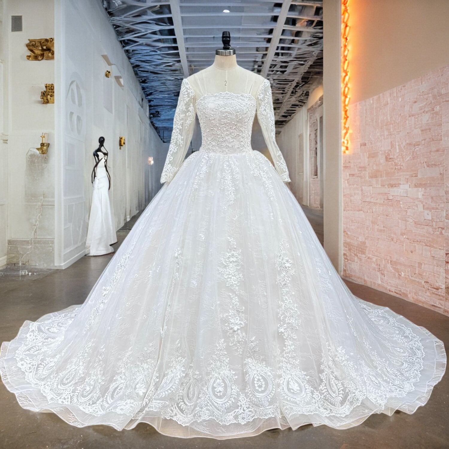 This Gorgeous Long Sleeve Satin Ball Gown Wedding Dress blends vintage sequined beading with a modern backless design for timeless elegance. Its classic silhouette and luxurious fabric create a stunning, royal look perfect for your special day.
