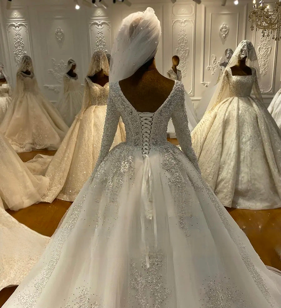 Step into elegance with this off-white Heavy Beaded Pearl Wedding Dress, featuring hand-beaded pearls, long sleeves, and a voluminous ball gown silhouette for a regal bridal look. Perfect for grand weddings, its intricate details and premium fabric ensure comfort, style, and unforgettable charm.