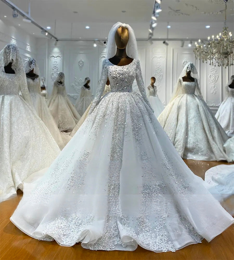 Heavy Beaded Pearl Wedding Dress Off-White Ball Gown Long Sleeves
