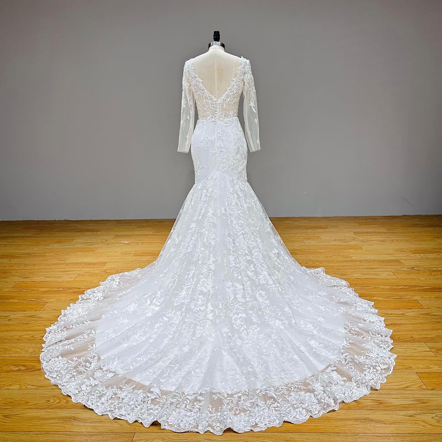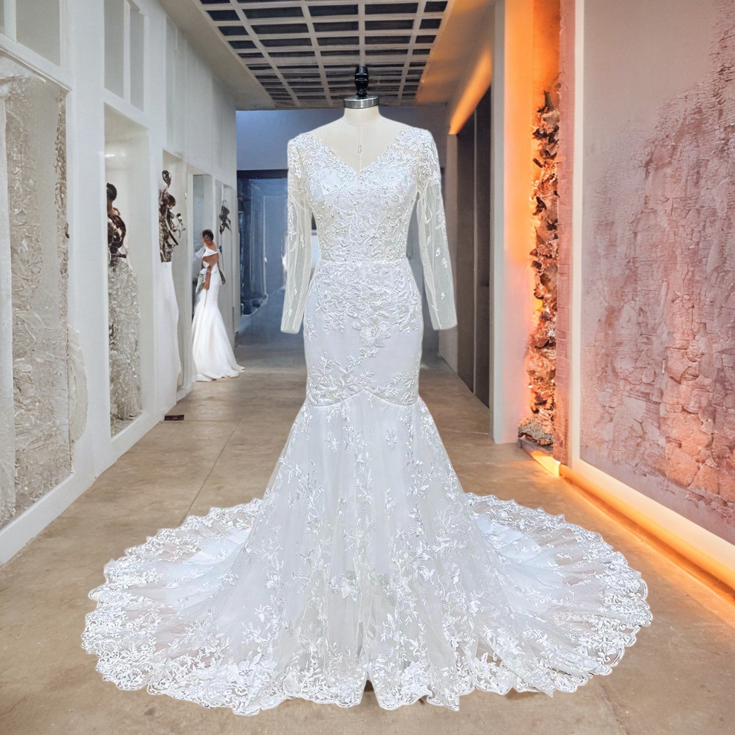 This long sleeve tulle mermaid wedding dress blends vintage charm with modern elegance, featuring a V-neckline and intricate sequined beading. Designed to flatter your silhouette, it adds a touch of romantic sophistication for an unforgettable bridal moment.