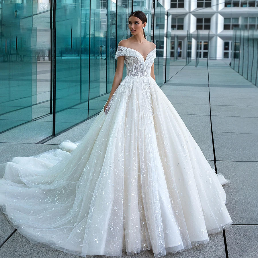 Luxury Polka Dot Wedding Dress with 3D Beaded Flowers – Shimmering Bridal Gown