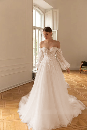 Off-Shoulder Lace A-line Wedding Gown with Long Sleeves & Sweetheart Neckline