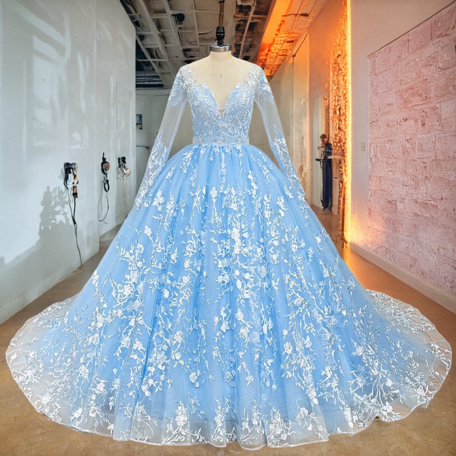 This Princess Ball Gown Wedding Dress features sequined beading, lace details, and a flattering belted waist for a timeless, elegant look. Perfect for any wedding, it blends classic charm with modern flair to make you feel like royalty.