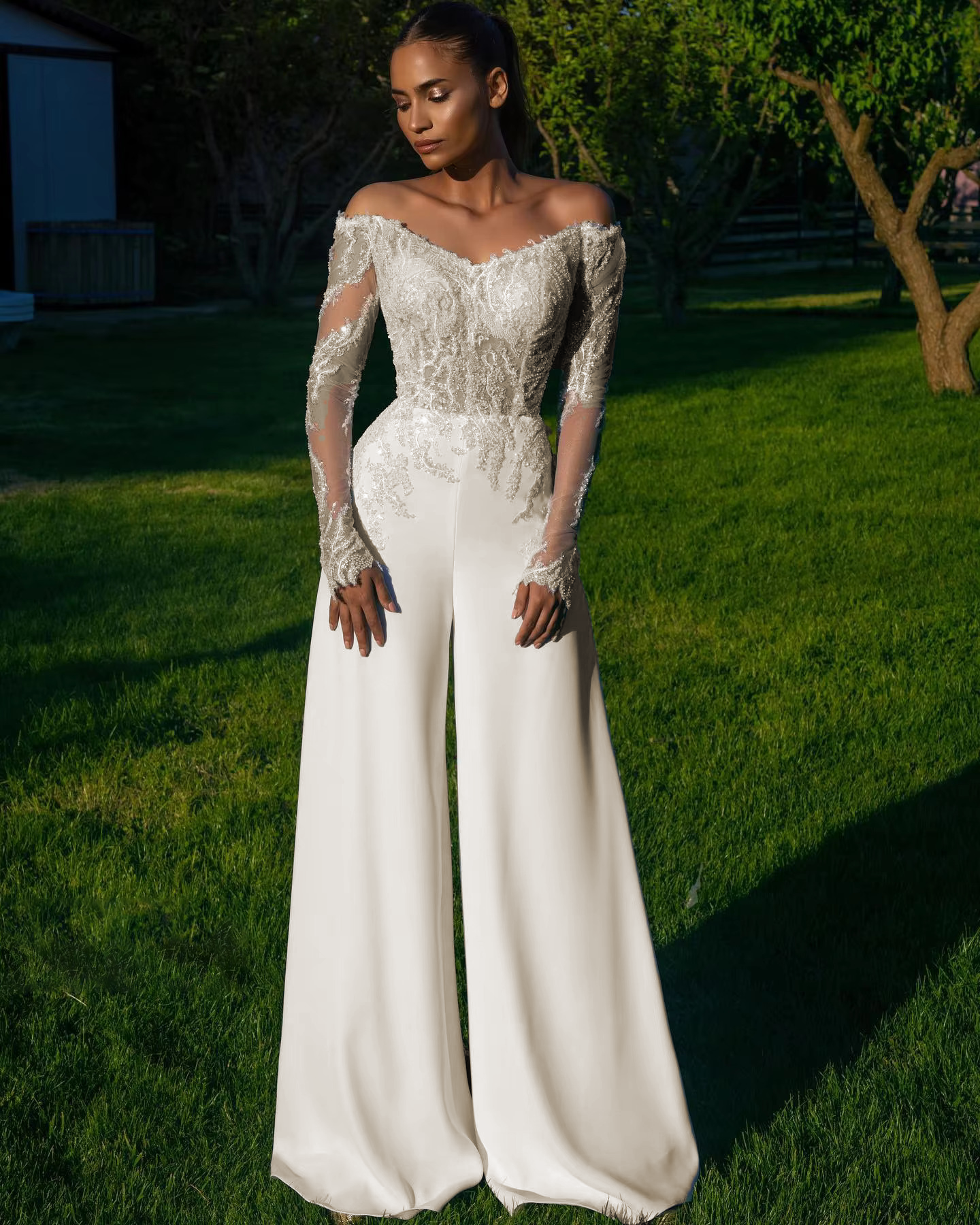 Off Shoulder Lace Applique Jumpsuit Wedding Dress with Long Sleeves