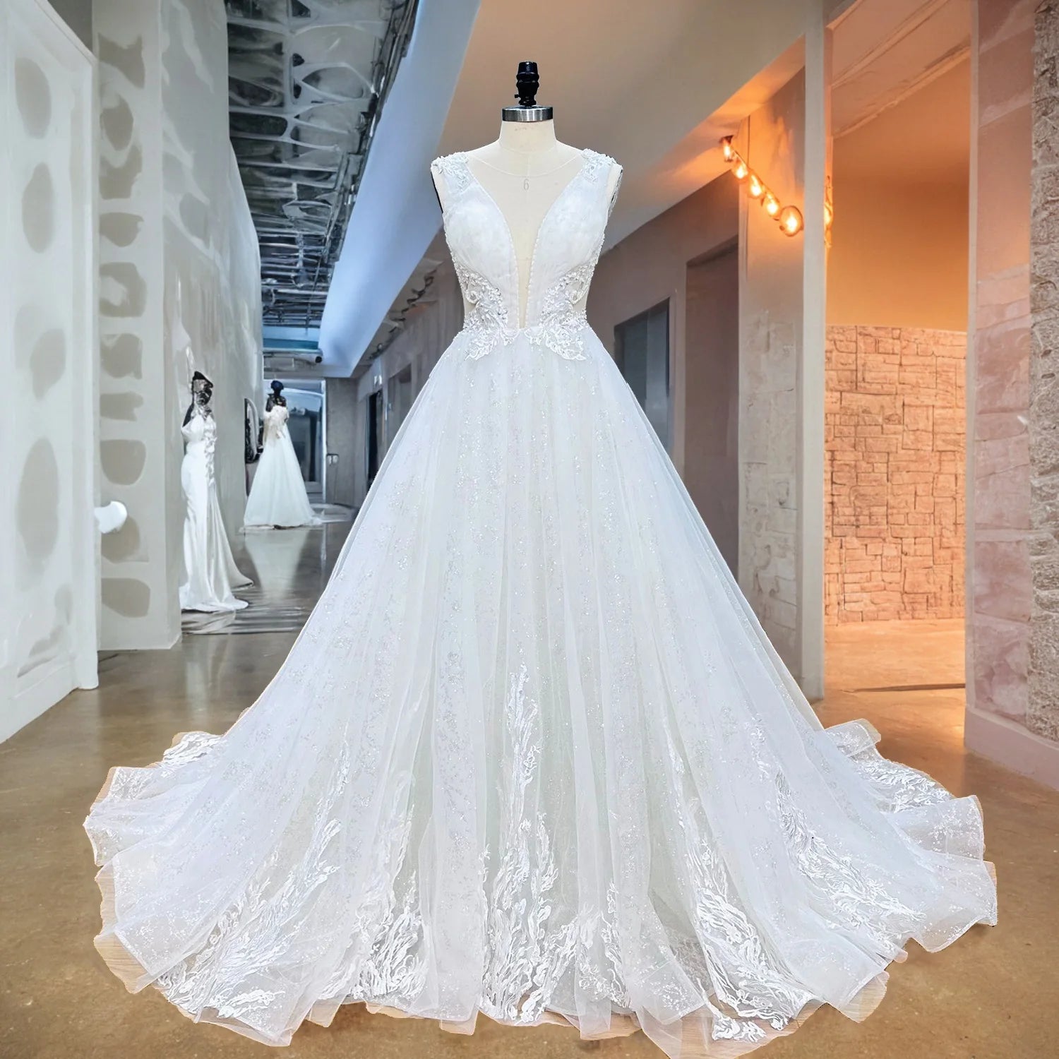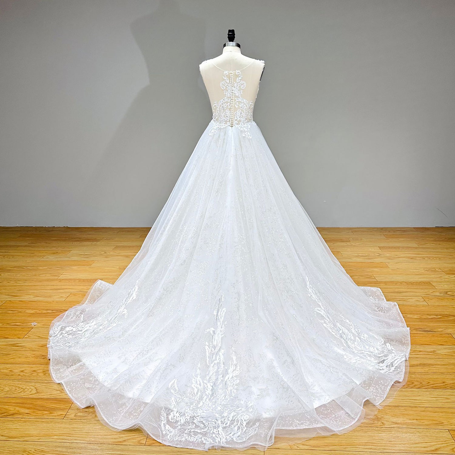 Make your wedding unforgettable with this Robe Mariage Beading Pearls A-Line Dress, featuring an off-the-shoulder neckline, intricate beading, and a flattering silhouette. The illusion back and sparkling details blend vintage charm with modern elegance for a truly stunning bridal look.