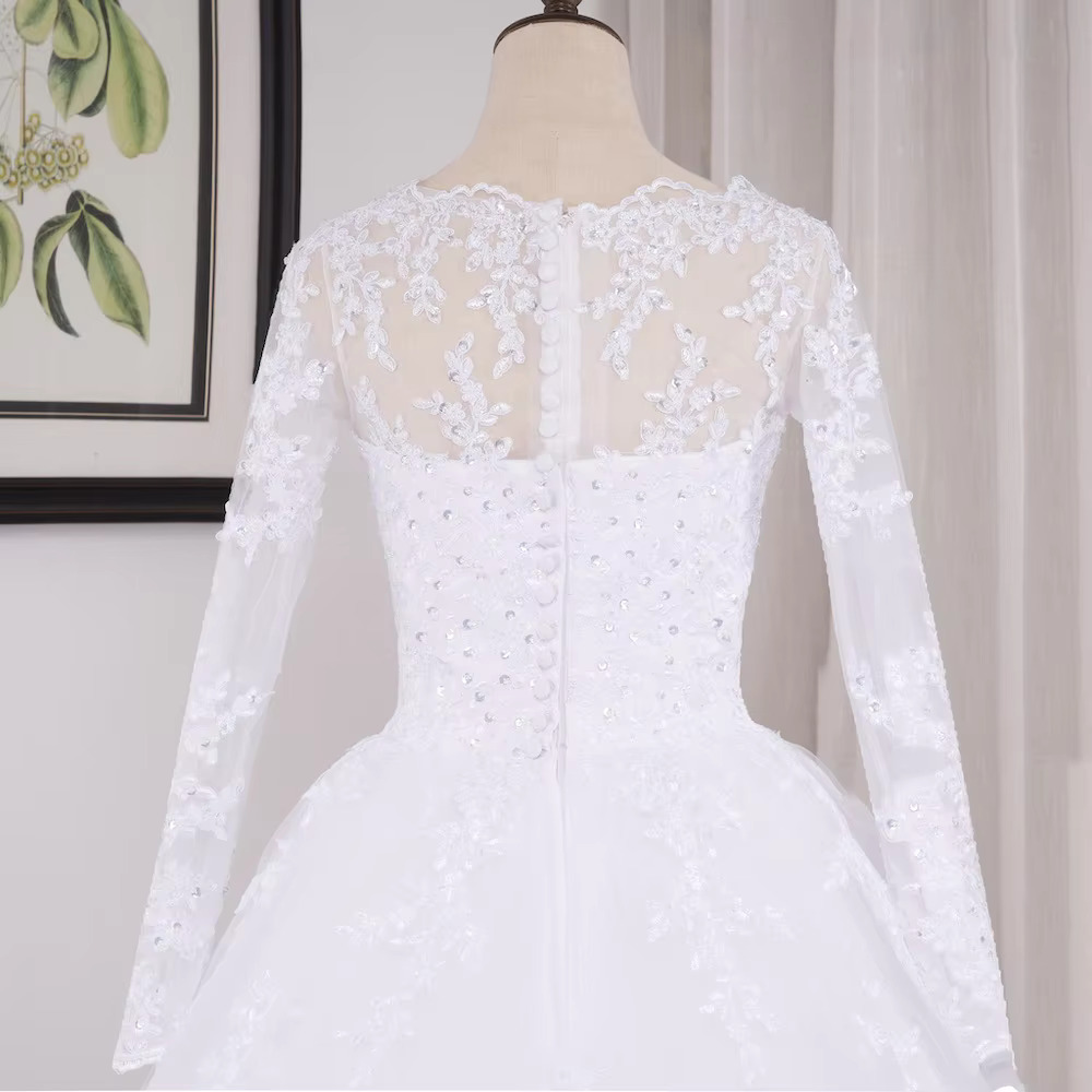 This Princess Ball Gown Wedding Dress features a full skirt, long sleeves, and intricate lace with beaded accents, blending traditional elegance with modern luxury. Designed to flatter every curve, it offers both comfort and a stunning, unforgettable bridal look.