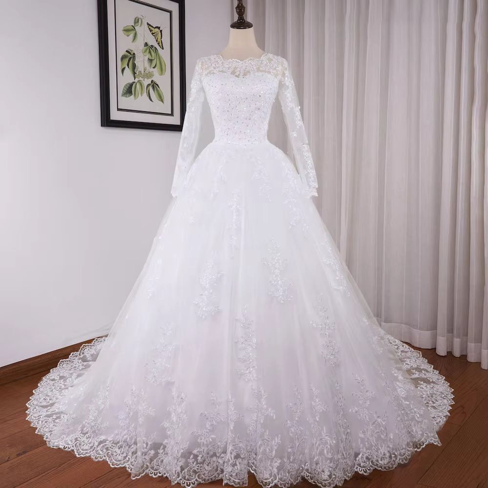 Princess Ball Gown Wedding Dress Long Sleeve Plus Size Lace Beading Bridal Gown