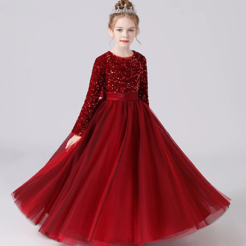Let your little princess shine in our Sparkling Pageant Party Princess Gown, adorned with floral embellishments and elegant long sleeves.Perfect for formal events, this enchanting dress blends grace, charm, and timeless beauty in every twirl.