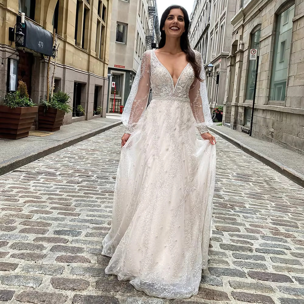 Elegant Shiny Long Sleeve Wedding Dress V-Neck Crystal Beading Appliques Bridal Gown