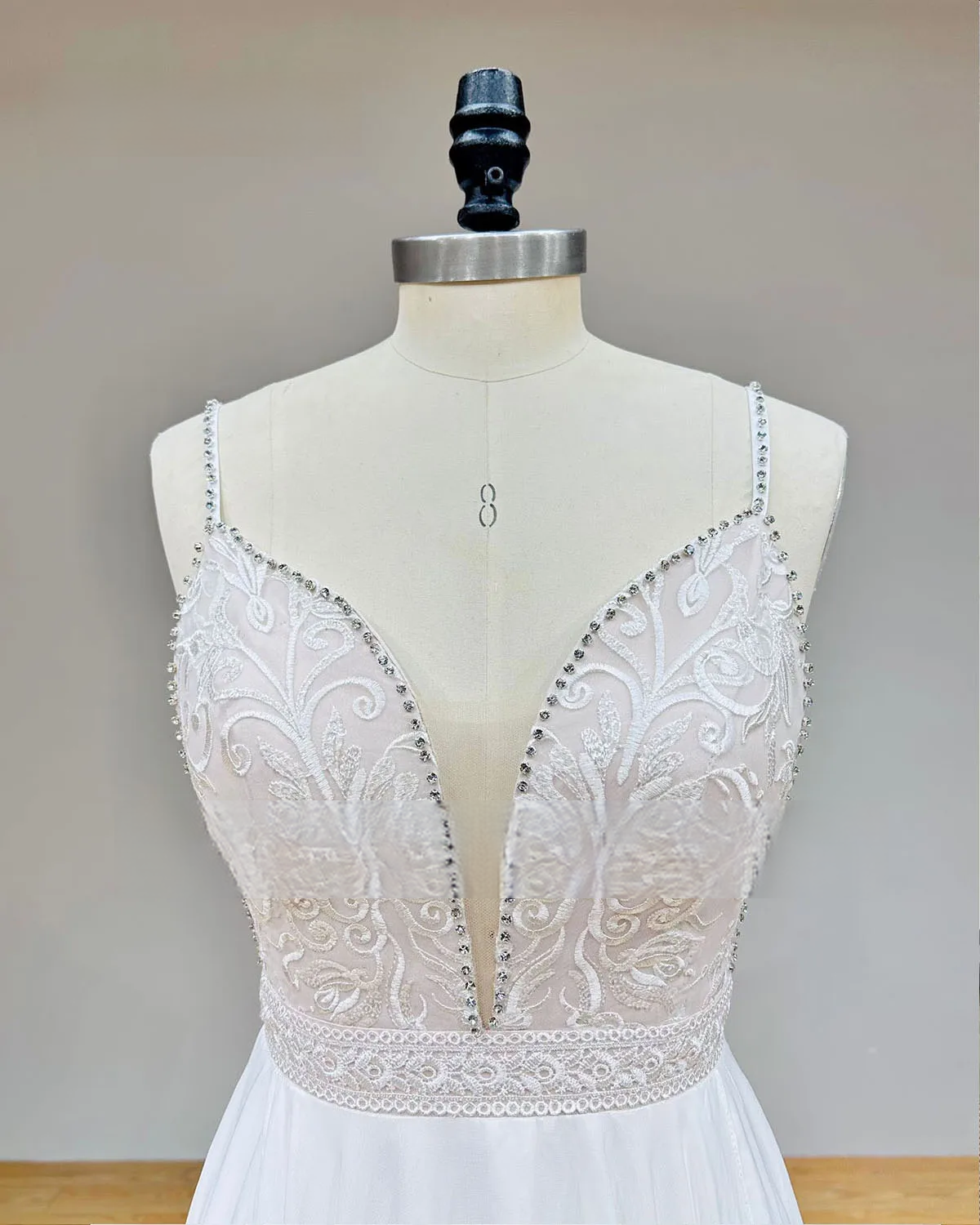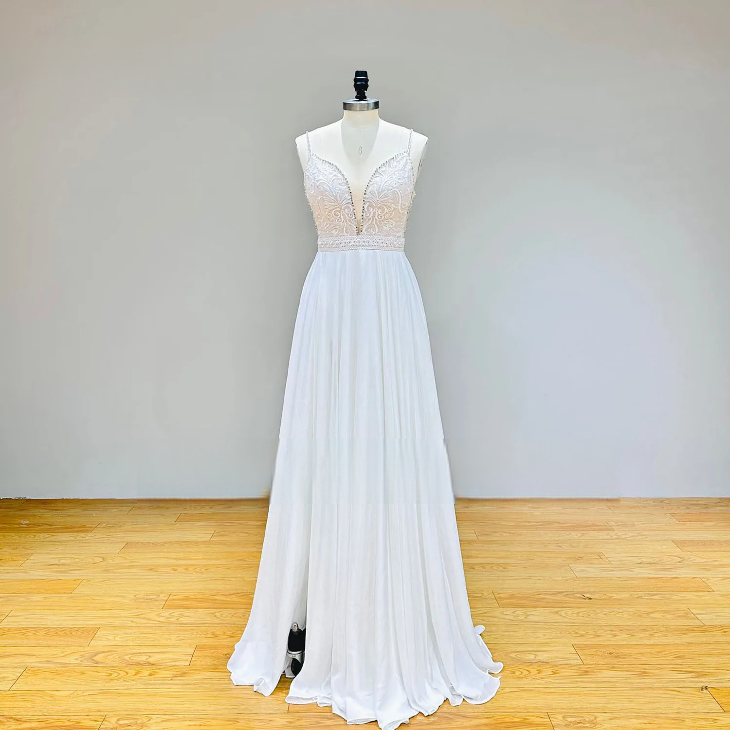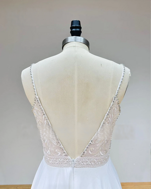 Make a statement on your special day with this crystal strap deep V-neck chiffon wedding dress, featuring a flowing silhouette, daring open back, and elegant skirt slit. Lightweight and breathable, it's perfect for beach, garden, or destination weddings—blending romance, modern charm, and timeless style.