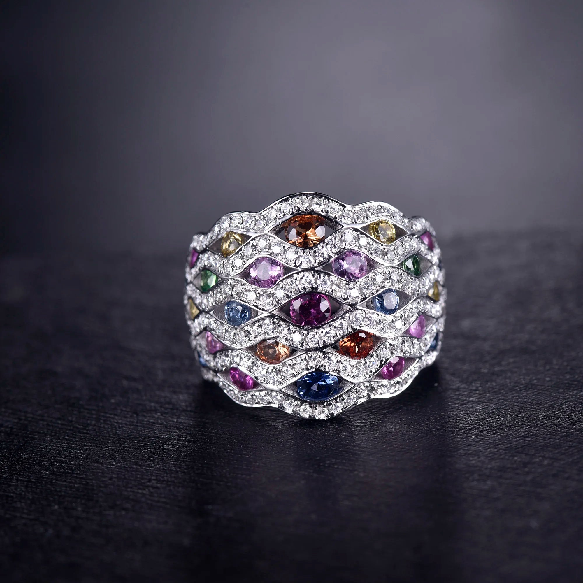 14K White Gold 7.33g Multicolor Sapphire & Diamond Engagement Ring for Women