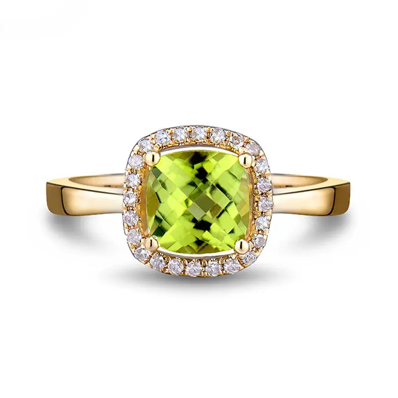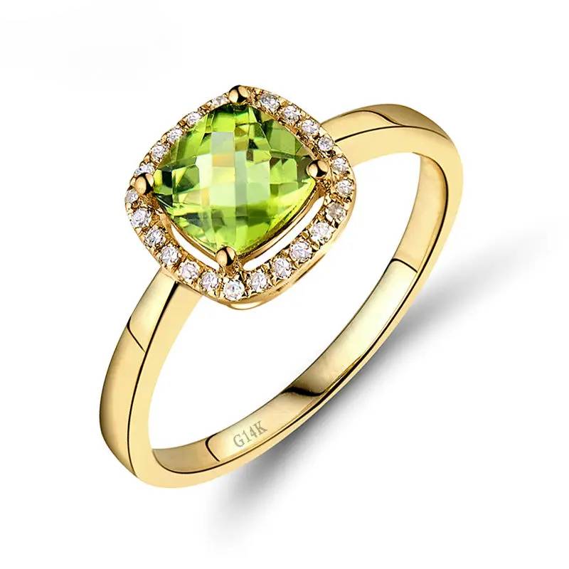 Real 14kt Yellow Gold Cushion Peridot Engagement Ring with Natural Diamonds 6x6mm