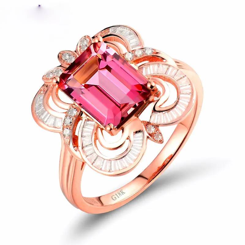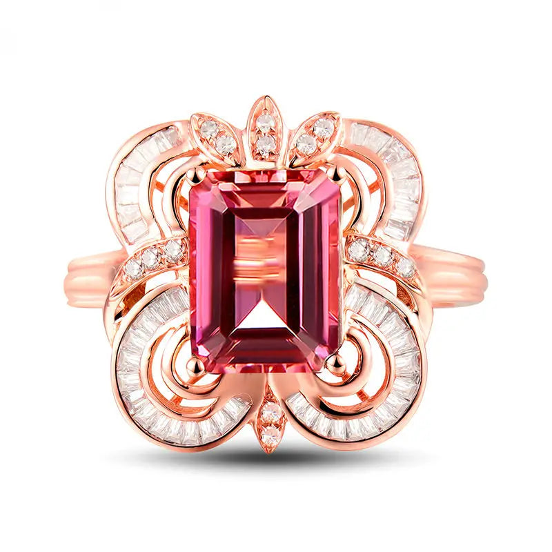 18kt Rose Gold Emerald-Cut Pink Tourmaline Diamond Ring for Women