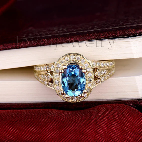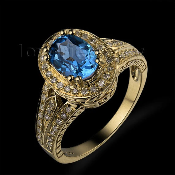 14K Yellow Gold Blue Topaz & Diamond Oval Ring – 6x8mm Engagement Jewelry