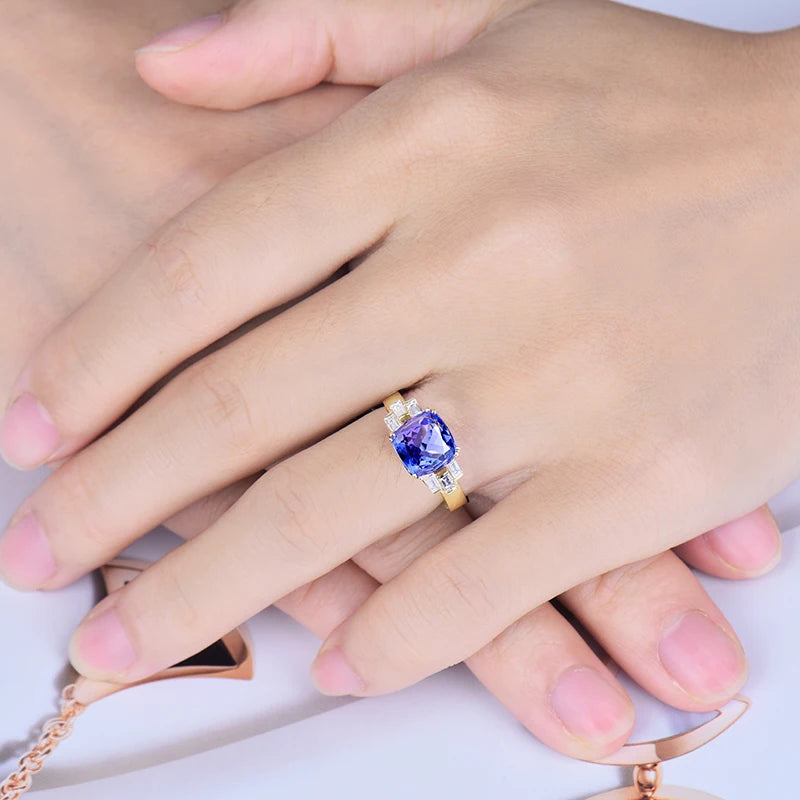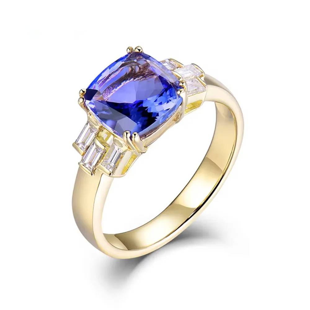 14K Yellow Gold Tanzanite & Diamond Cushion Ring – 8x8mm Engagement Jewelry for Women