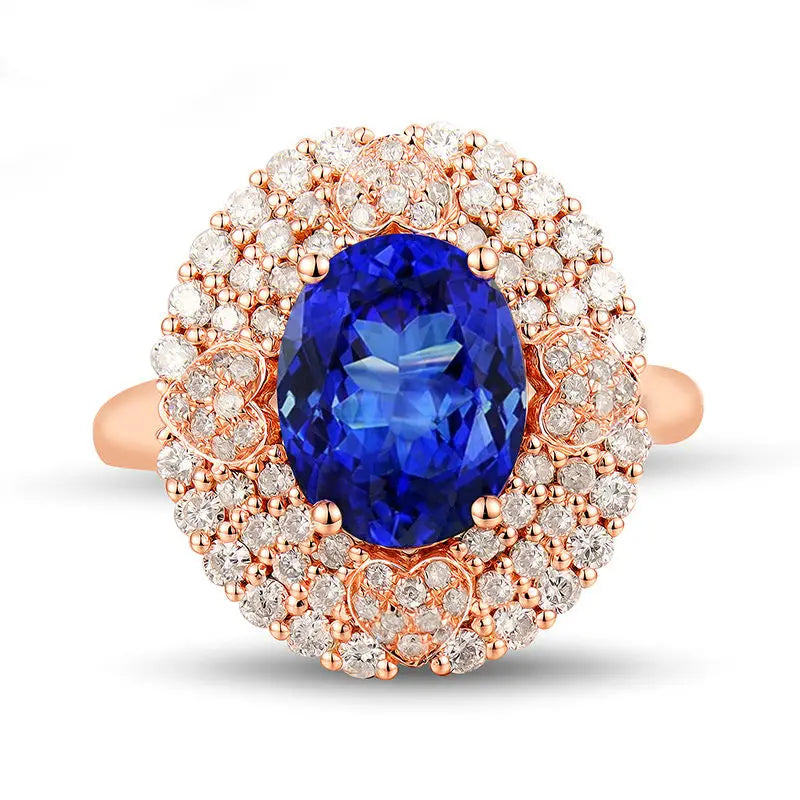 Natural AAAA Tanzanite Oval Ring 14K Rose Gold Diamond Birthstone Jewelry