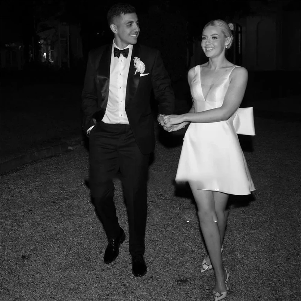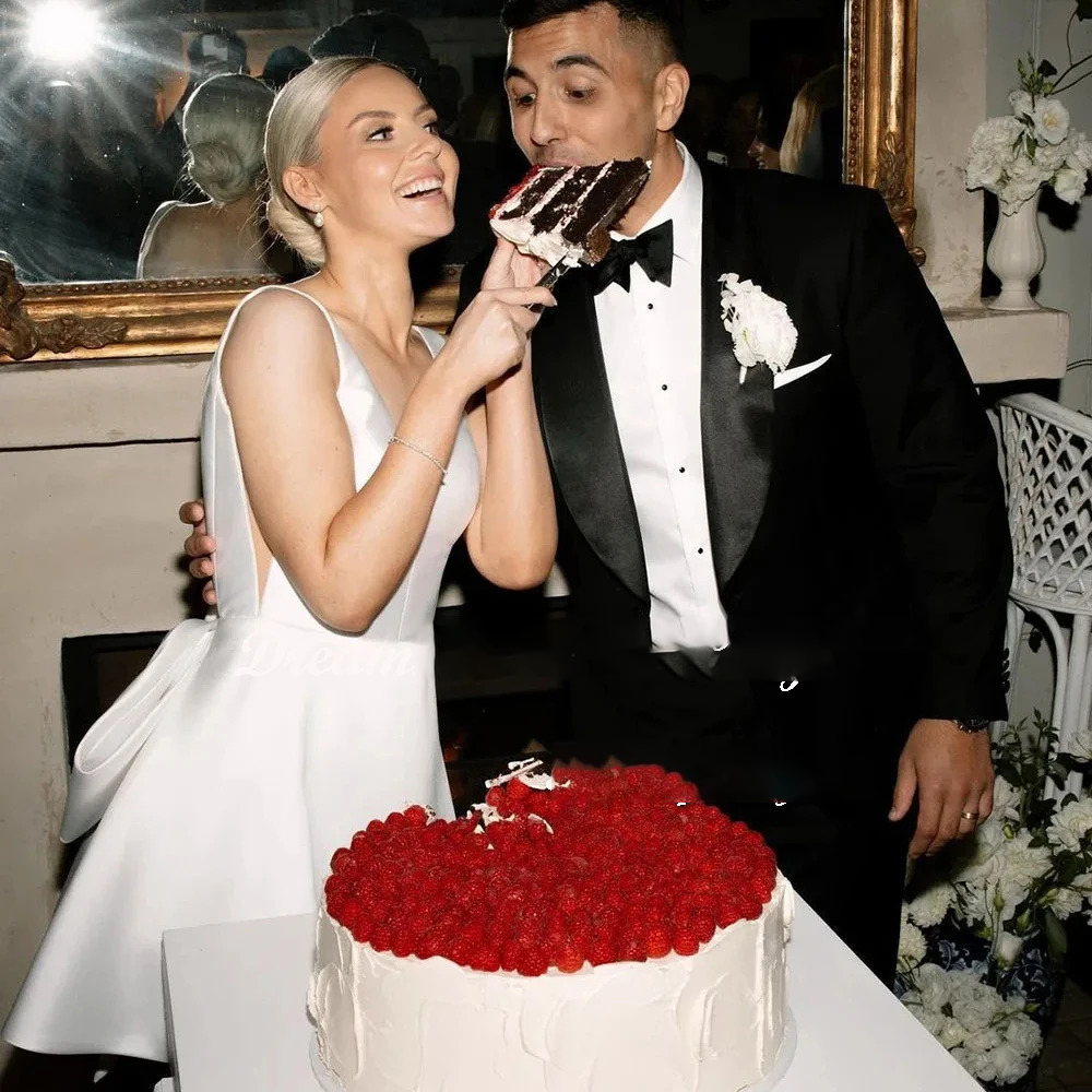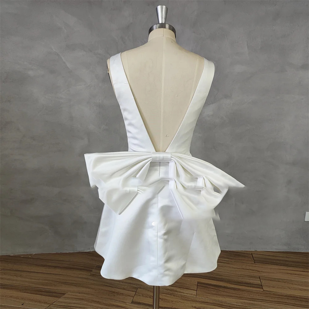 DREAM Sleeveless Satin Short Wedding Dress Big Bow V Neck Backless A-Line Bridal Gown