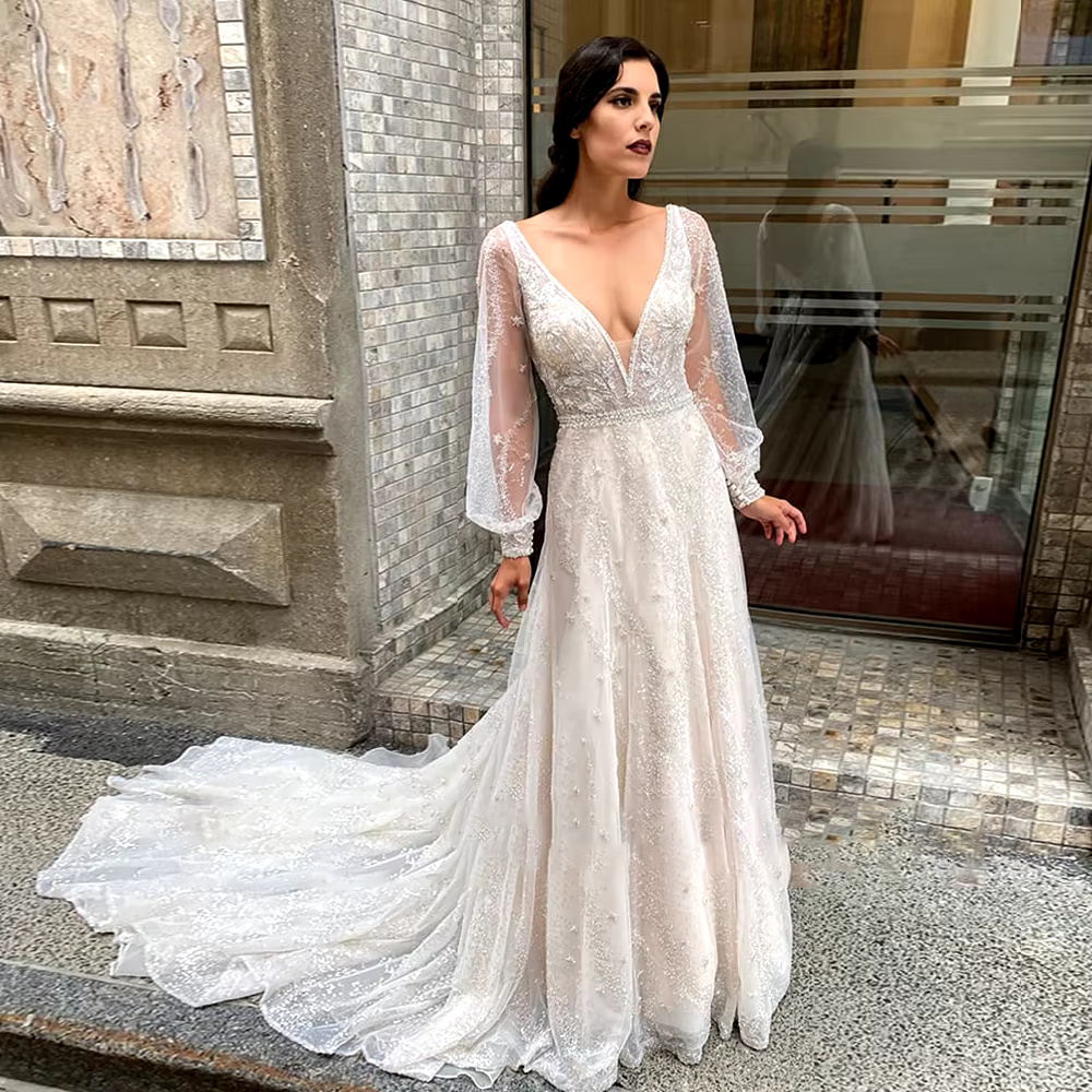 Step into elegance with this long sleeve V-neck wedding dress, adorned with sparkling crystal beading and delicate appliques. Its luxurious fabric and refined design create a timeless, radiant look for your special day.