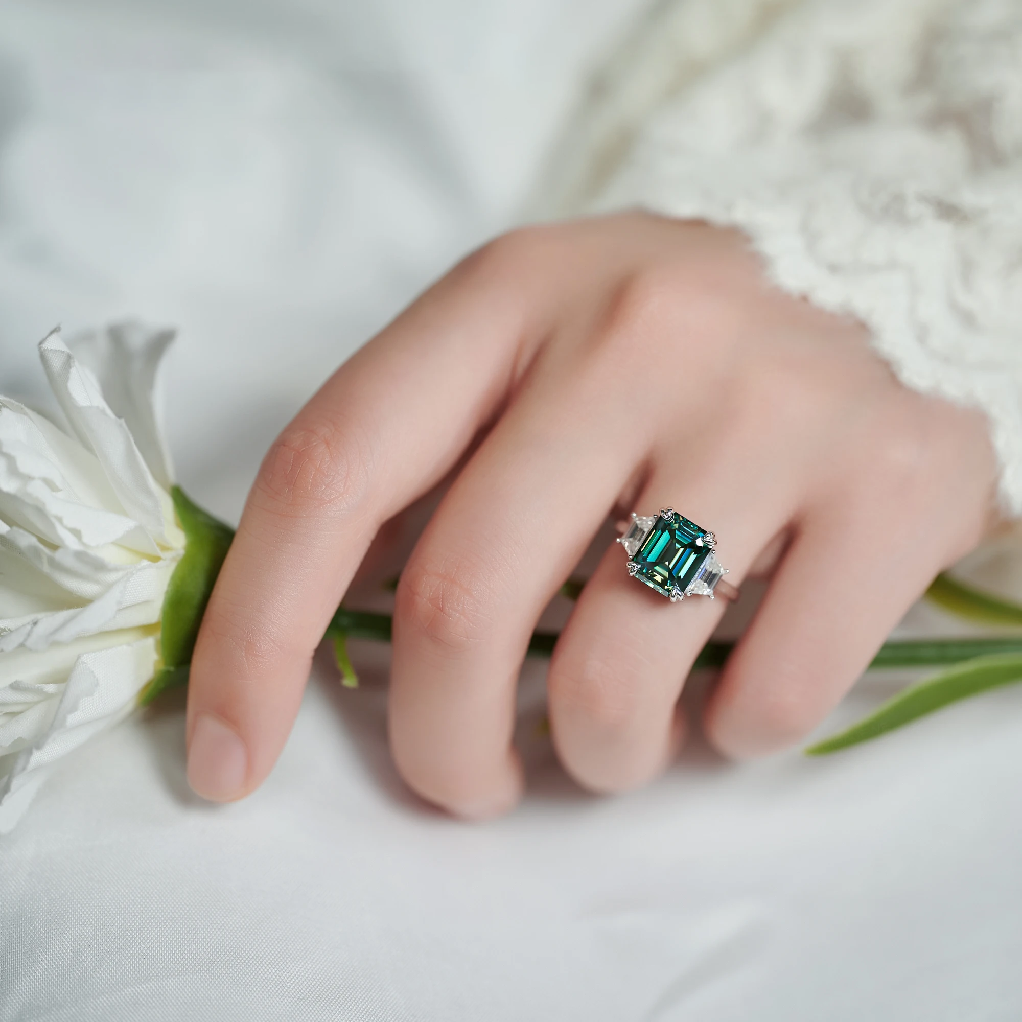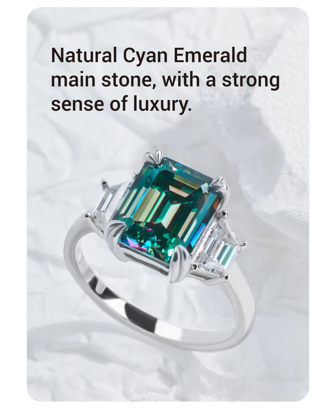 Moissanite Emerald Cut Natural Cyan 8X10mm 4.0ct S925 Silver Ring Diamond