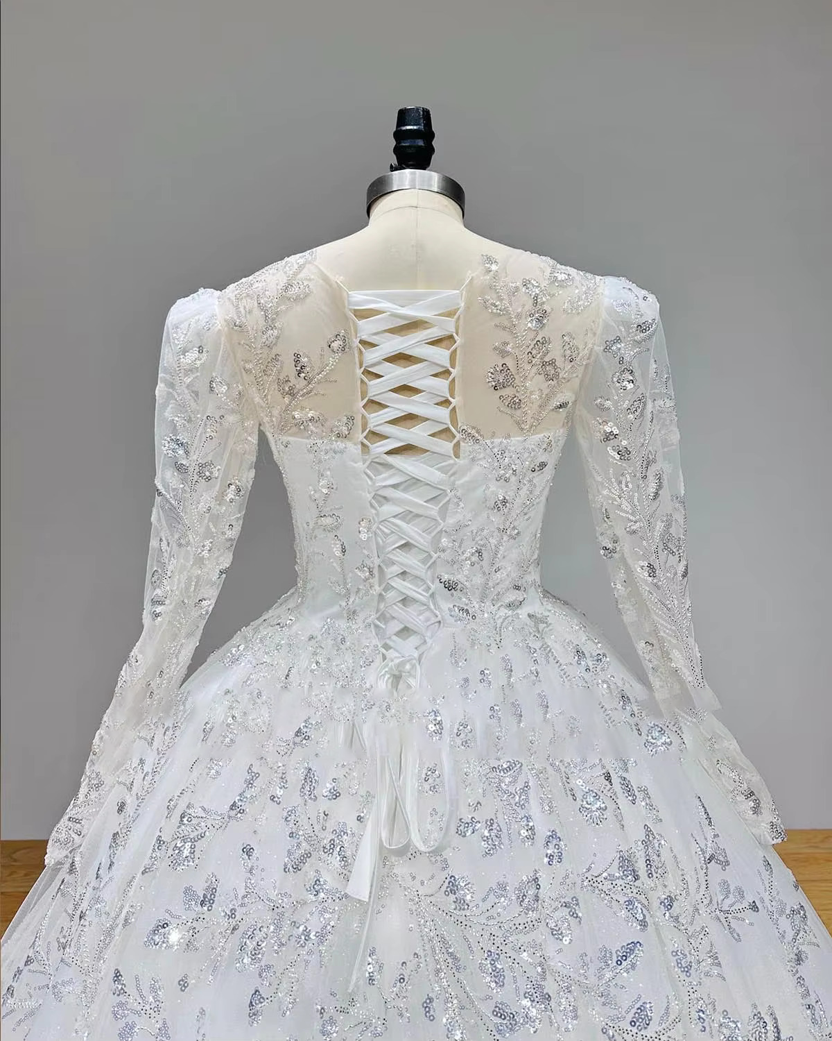 Step into your fairytale with the Robe Mariage Glitter Ball Gown Wedding Dress, featuring sparkling glitter fabric, intricate lace, and beaded details. The dramatic ball gown silhouette and lace-up back offer a perfect fit for a romantic, glamorous celebration.