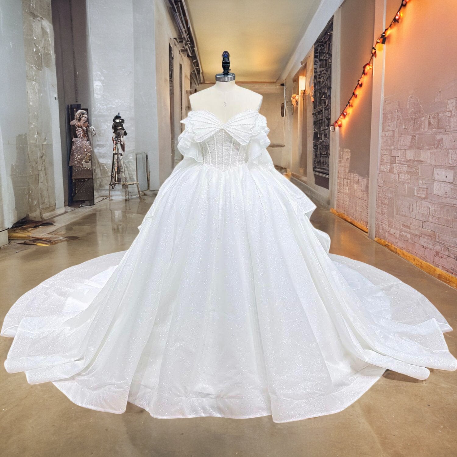 Beaded Pearl Ball Gown Wedding Dress with Bow Off the Shoulder Luxury Bridal Gown