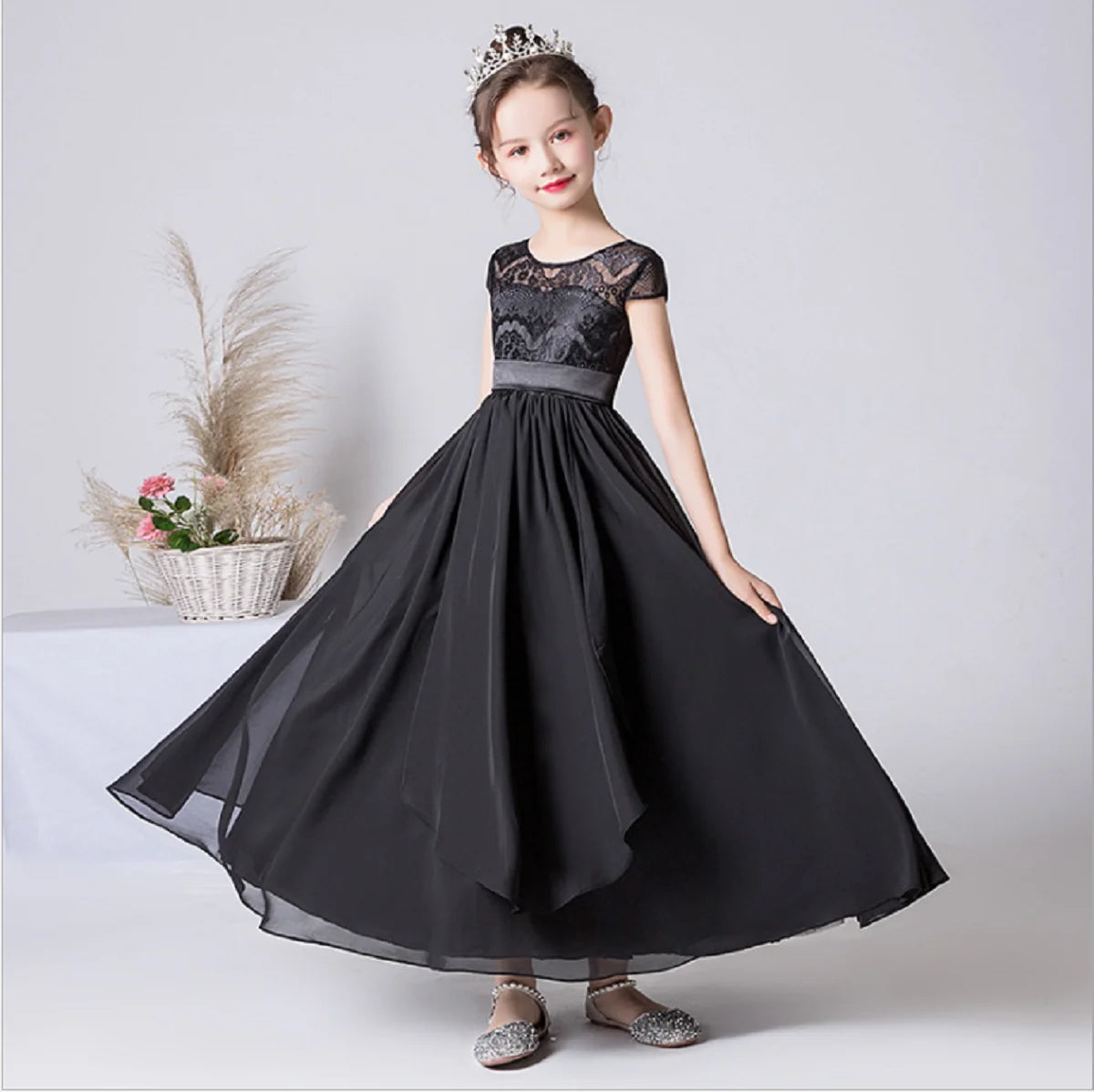 Elegant black chiffon lace dress for junior bridesmaids, perfect for weddings, parties, and communion ceremonies. Features soft chiffon, delicate lace, and a charming waist flower for timeless style and comfort.