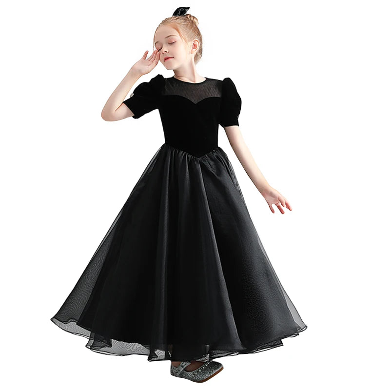 Black Puff Sleeves Girls Dress Corduroy Tulle Party Gown