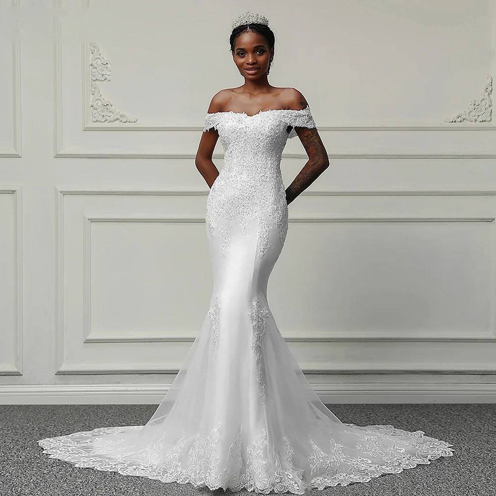 Boat Neck Mermaid Wedding Dress with Hand Beaded Appliqué for Women