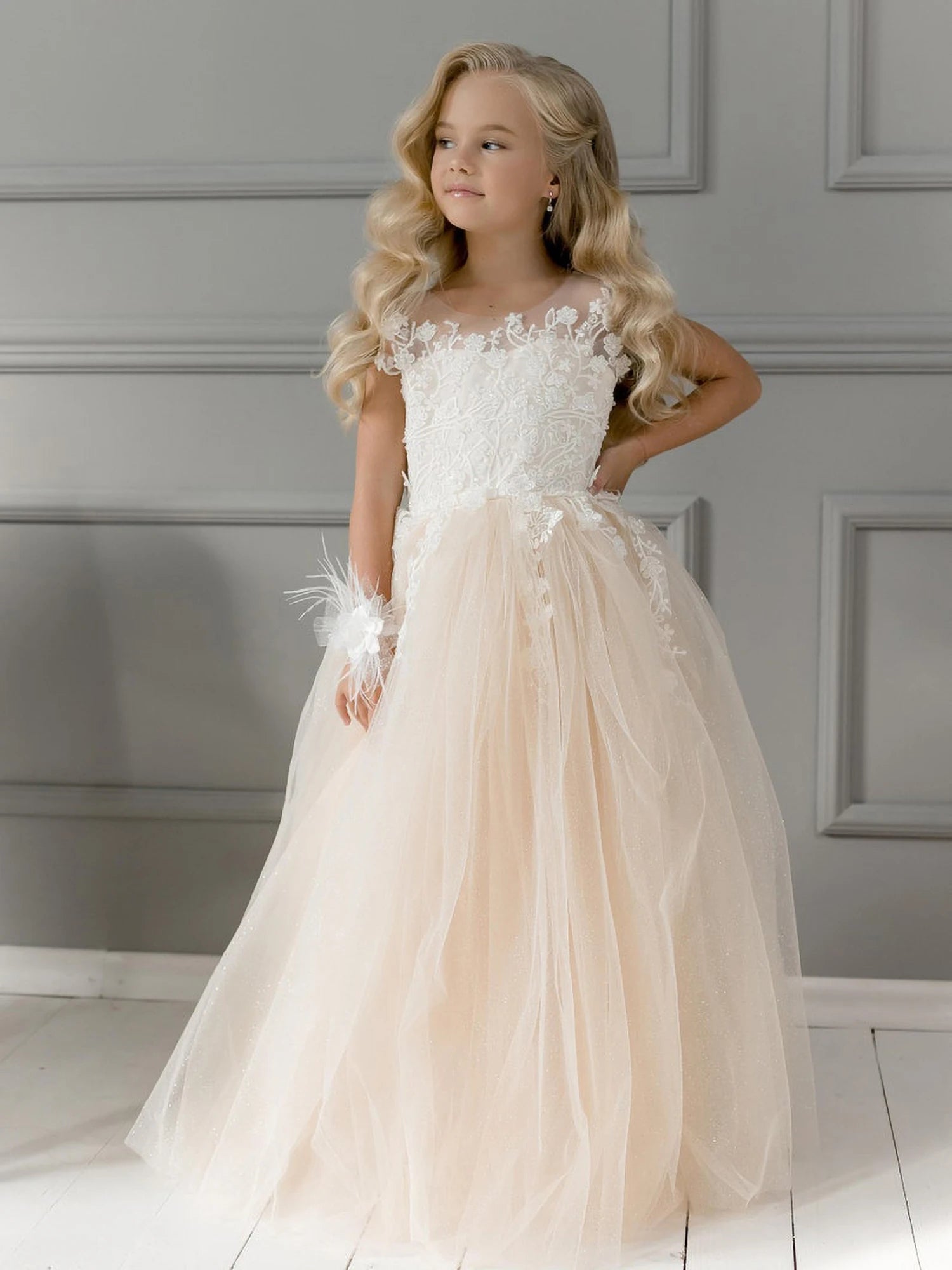 Champagne Glitter Lace Tulle Toddler Floral Ball Gown