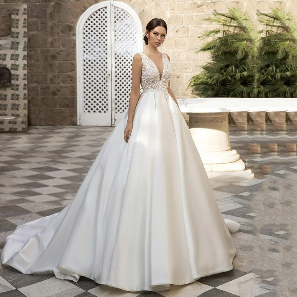 Country Wedding Dress A-Line Ball Gown V-Neck Bridal Dress Satin Bridal Gown