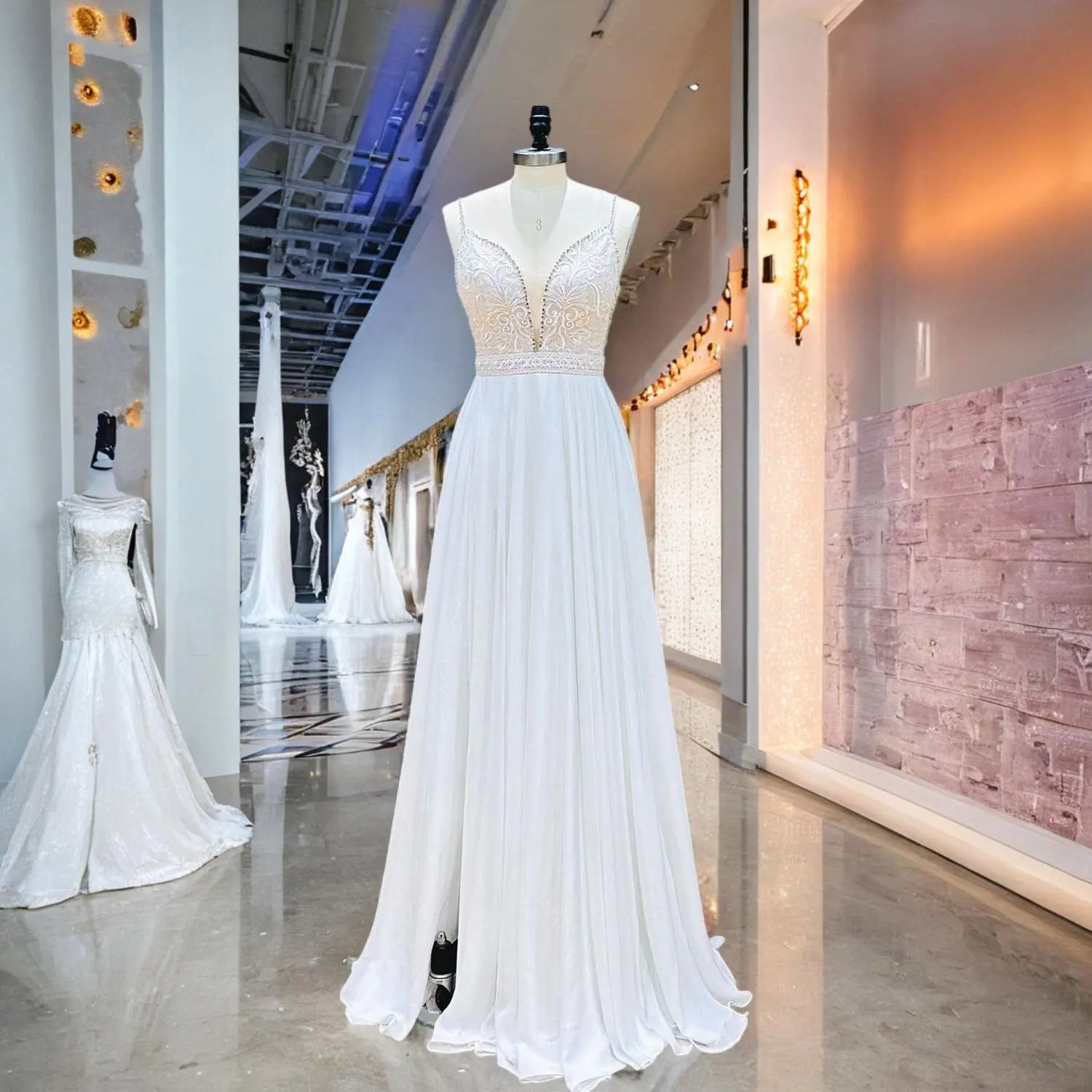 Make a statement on your special day with this crystal strap deep V-neck chiffon wedding dress, featuring a flowing silhouette, daring open back, and elegant skirt slit. Lightweight and breathable, it's perfect for beach, garden, or destination weddings—blending romance, modern charm, and timeless style.