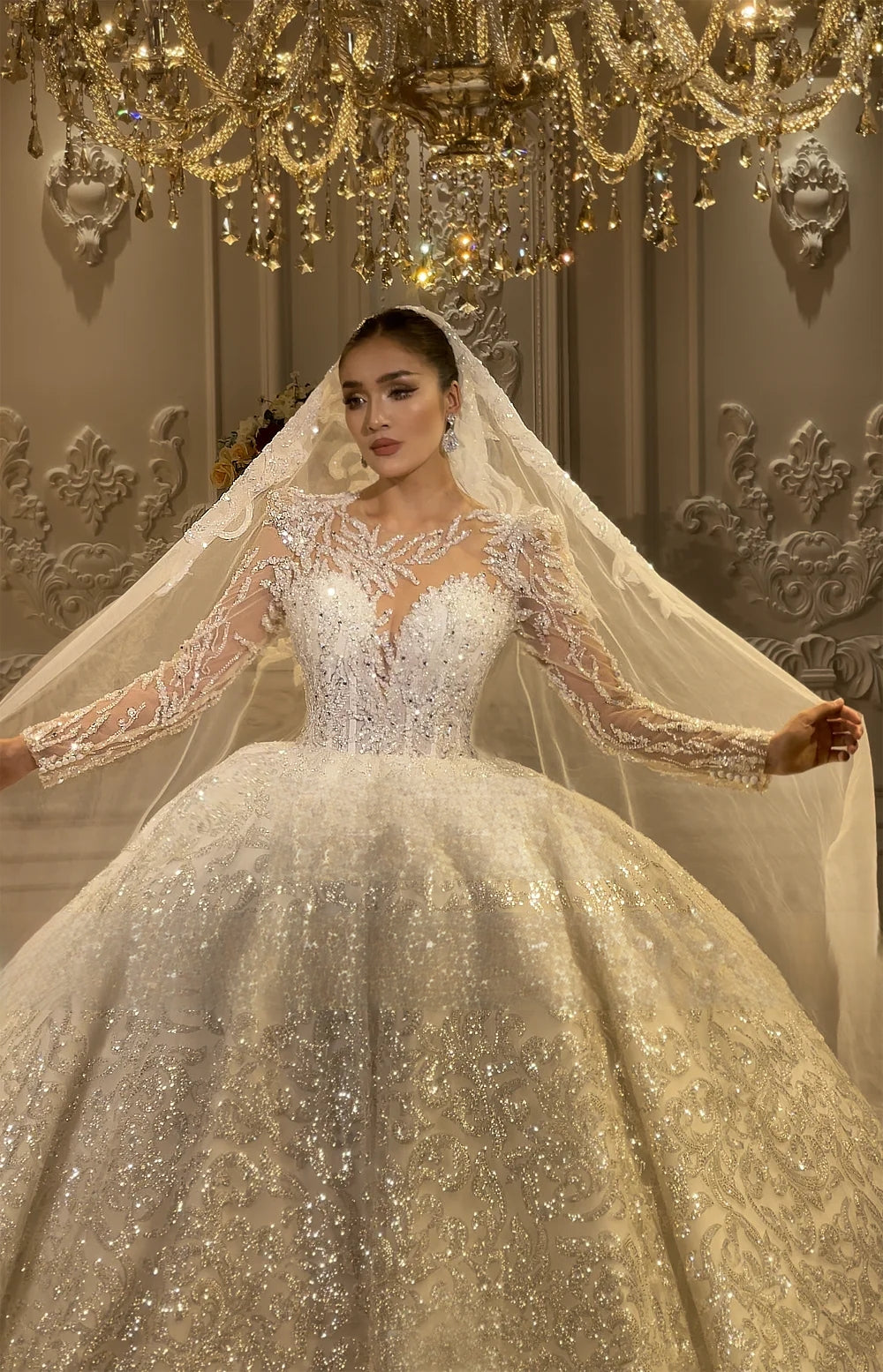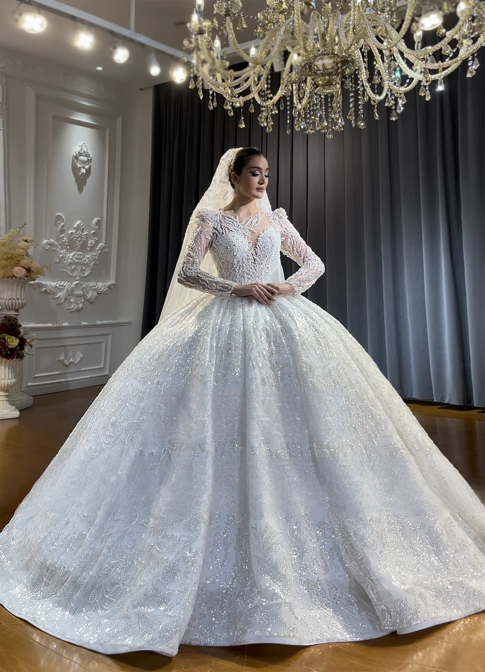 Make a grand entrance on your special day in this Elegant Lace Appliqué Ball Gown Wedding Dress with Long Sleeves, featuring intricate lace, a voluminous skirt, and a sweeping train for a fairytale finish. With its illusion neckline, sheer lace sleeves, and timeless charm, this gown exudes elegance and romance for the modern bride.