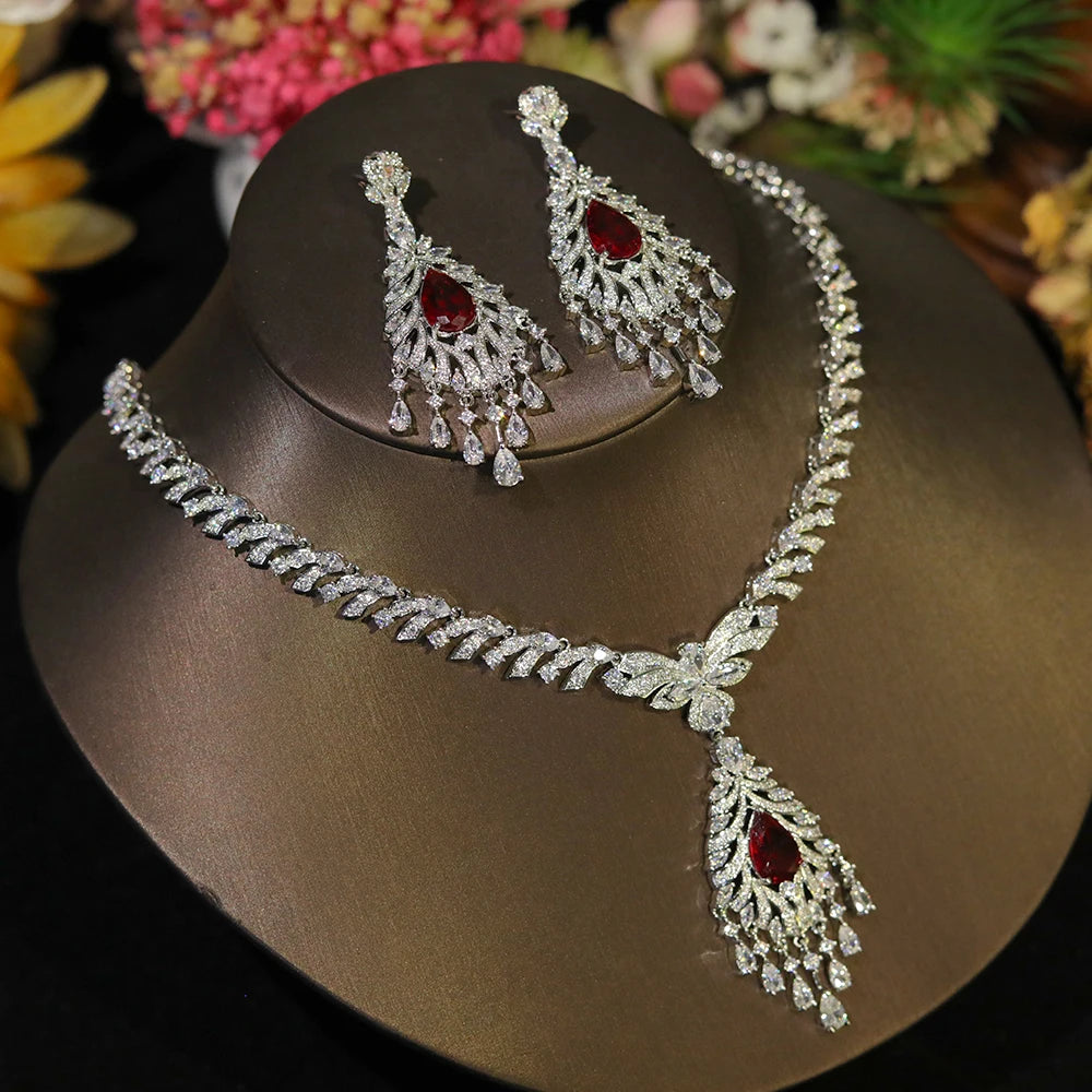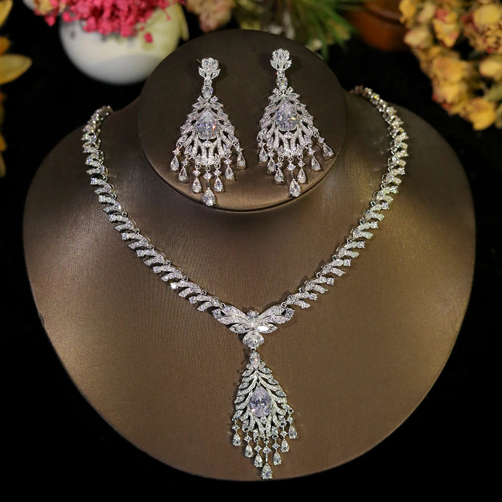 Add elegance to your special day with this luxury CZ dangle tassel jewelry set. Featuring a stunning necklace and earrings, it's perfect for weddings and parties.