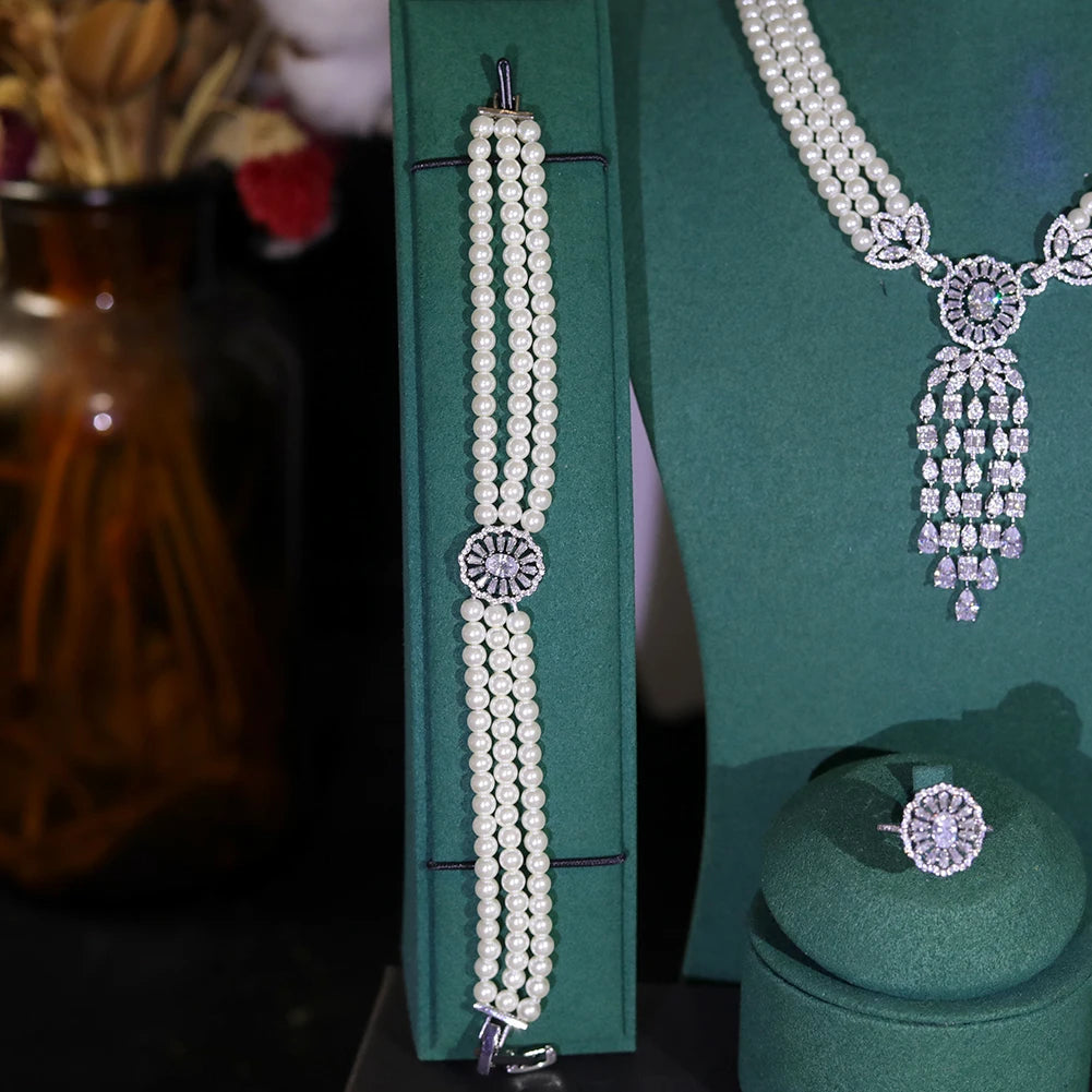 Enhance your bridal look with this elegant 4PCS Dubai jewelry set. Featuring a layered white pearl necklace, tassel pendant, and matching earrings, it's perfect for weddings and parties.