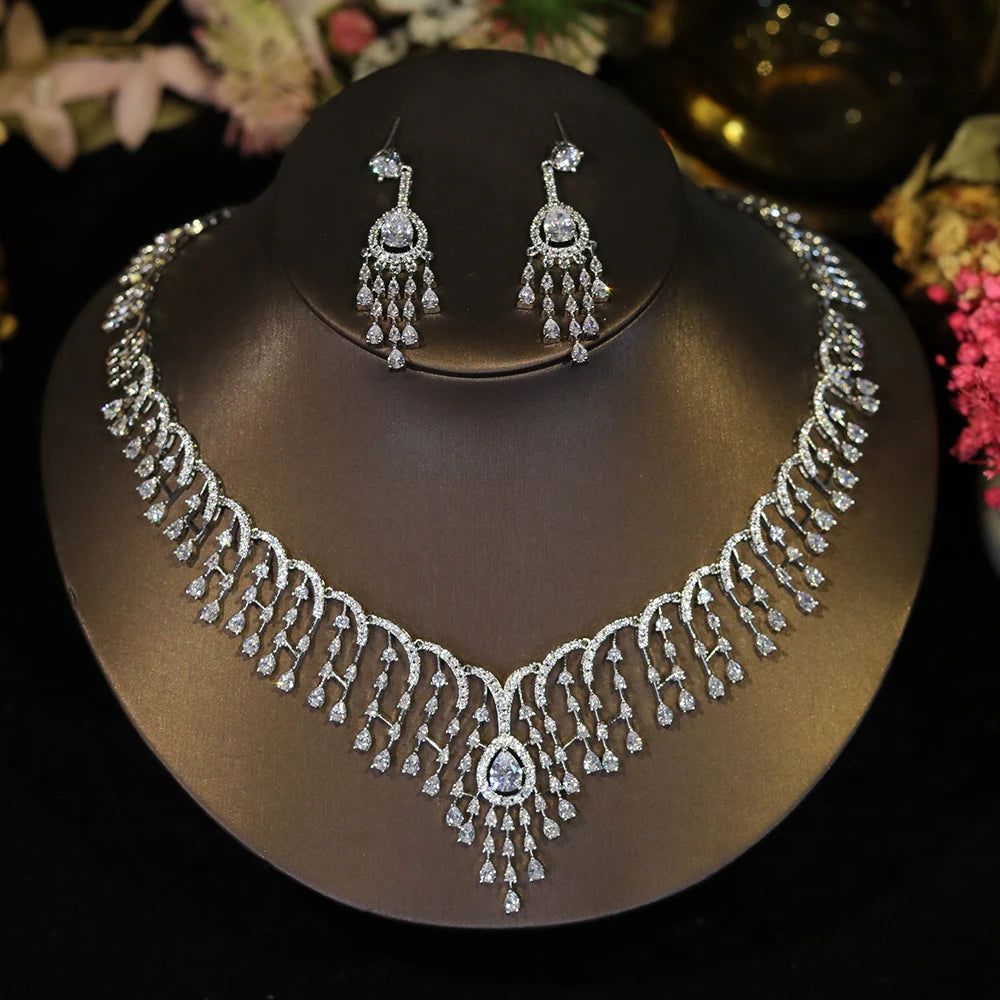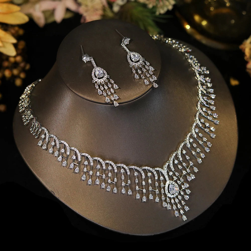 Dubai Bridal White CZ Tassel Necklace Set – Luxury Wedding Jewelry Gift for Women