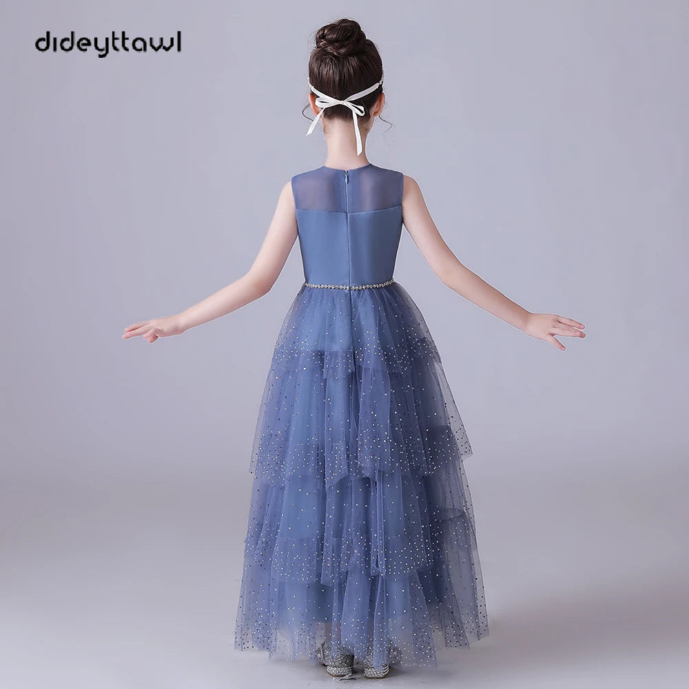 Dusty Blue Beaded Sleeveless Pleated Tulle Girls Dress