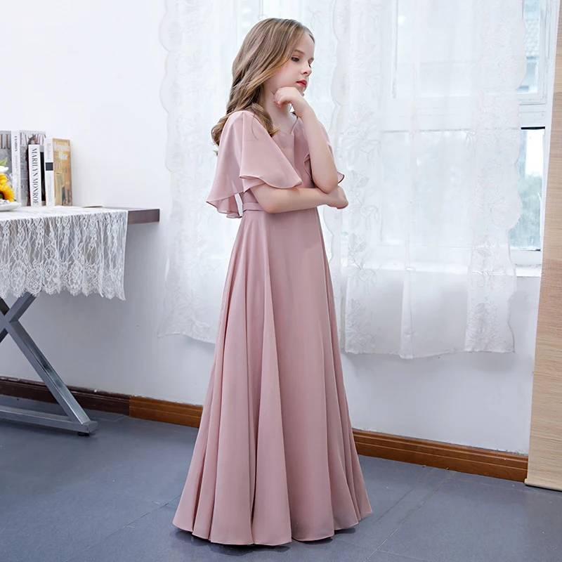 Dusty Pink Long Chiffon Junior Bridesmaid Dress with Pleats Flower Girl Gown