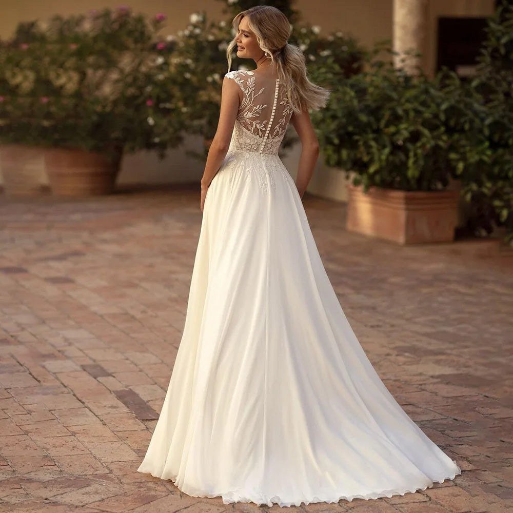 Boho Lace A-Line Chiffon Sexy Leg Slit Wedding Dress with Illusion Back