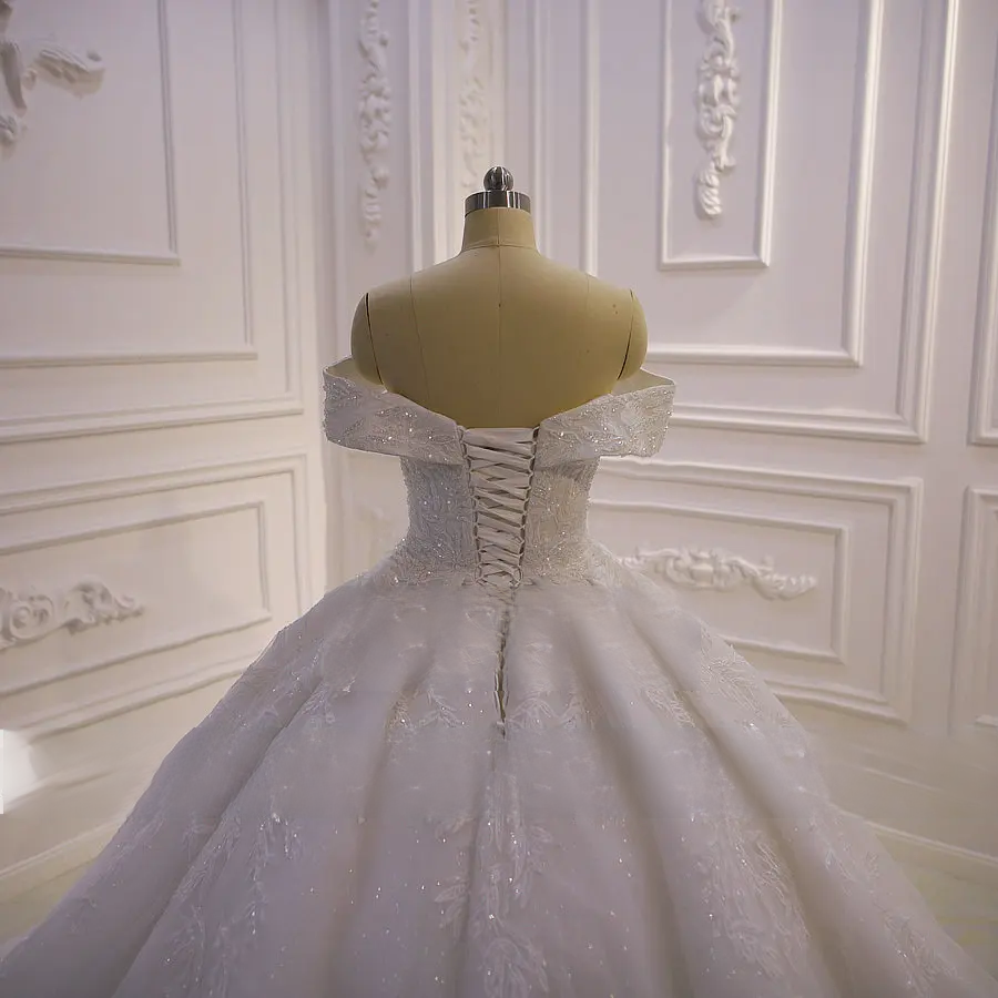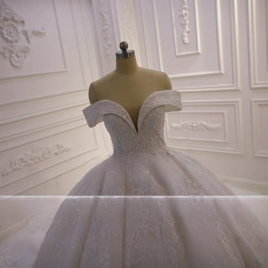 Elegant Off the Shoulder Full Lace Beading Wedding Gown with Delicate Straps. Designed with intricate lacework and sparkling bead details, this timeless bridal dress is perfect for a graceful wedding look.