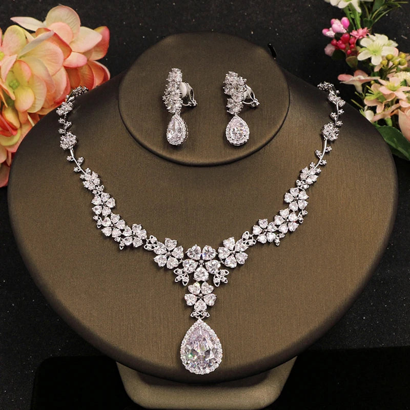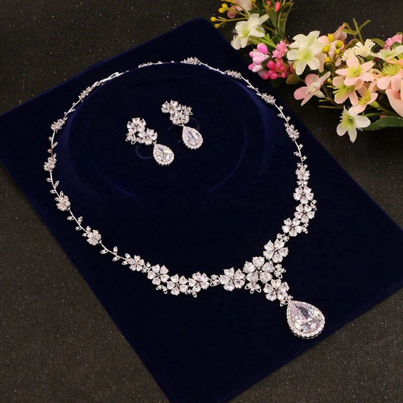 Flower Crystal Bridal Necklace & Earrings Set with Water Drop Pendant