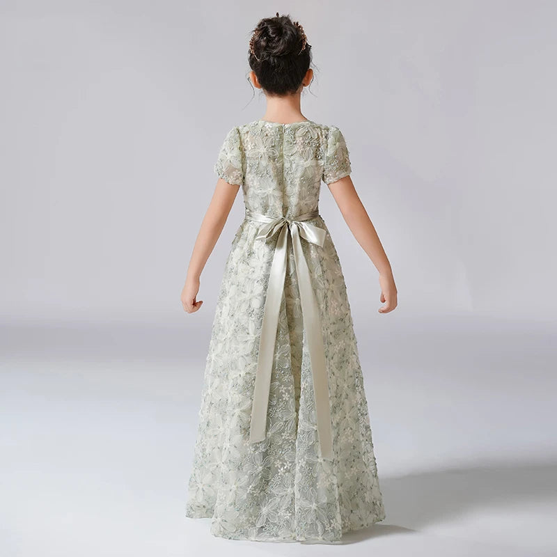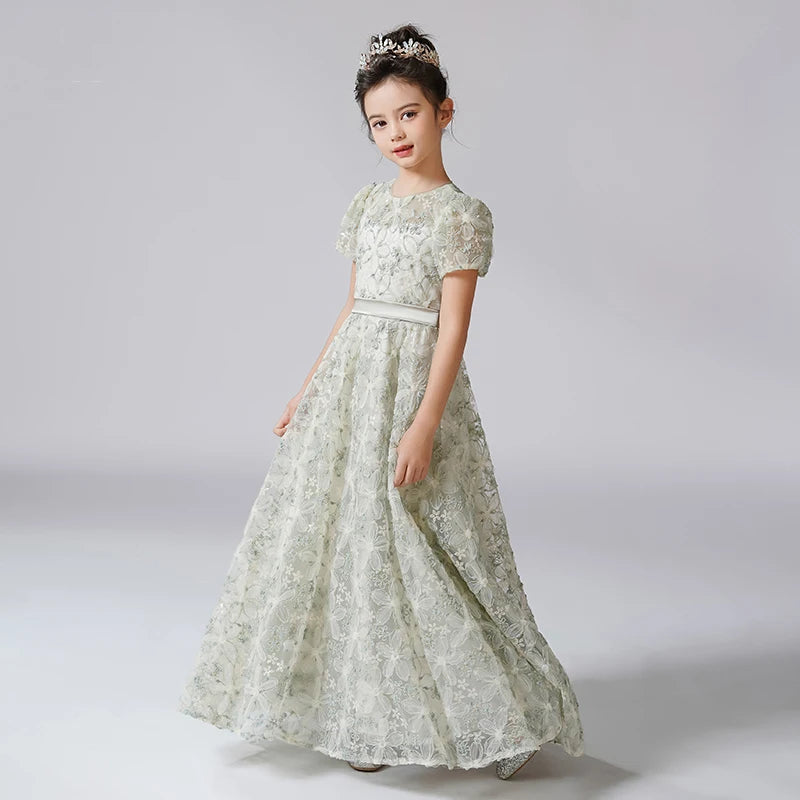 Flower Lace Dress for Girls Puff Sleeves Princess Gown for Birthday and Formal Events