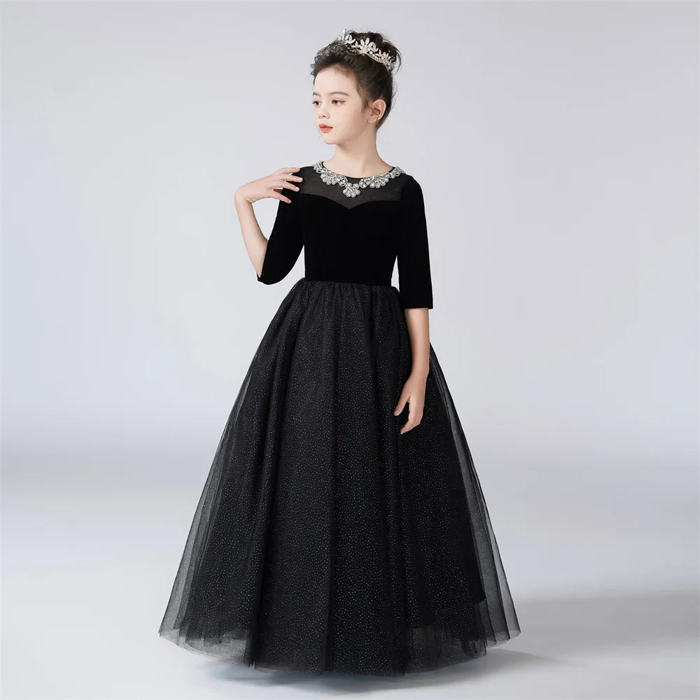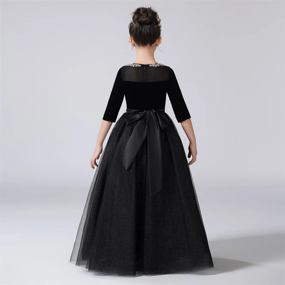 Girls Rhinestone Tulle Flower Dress with Half Sleeves – Princess Birthday Gown