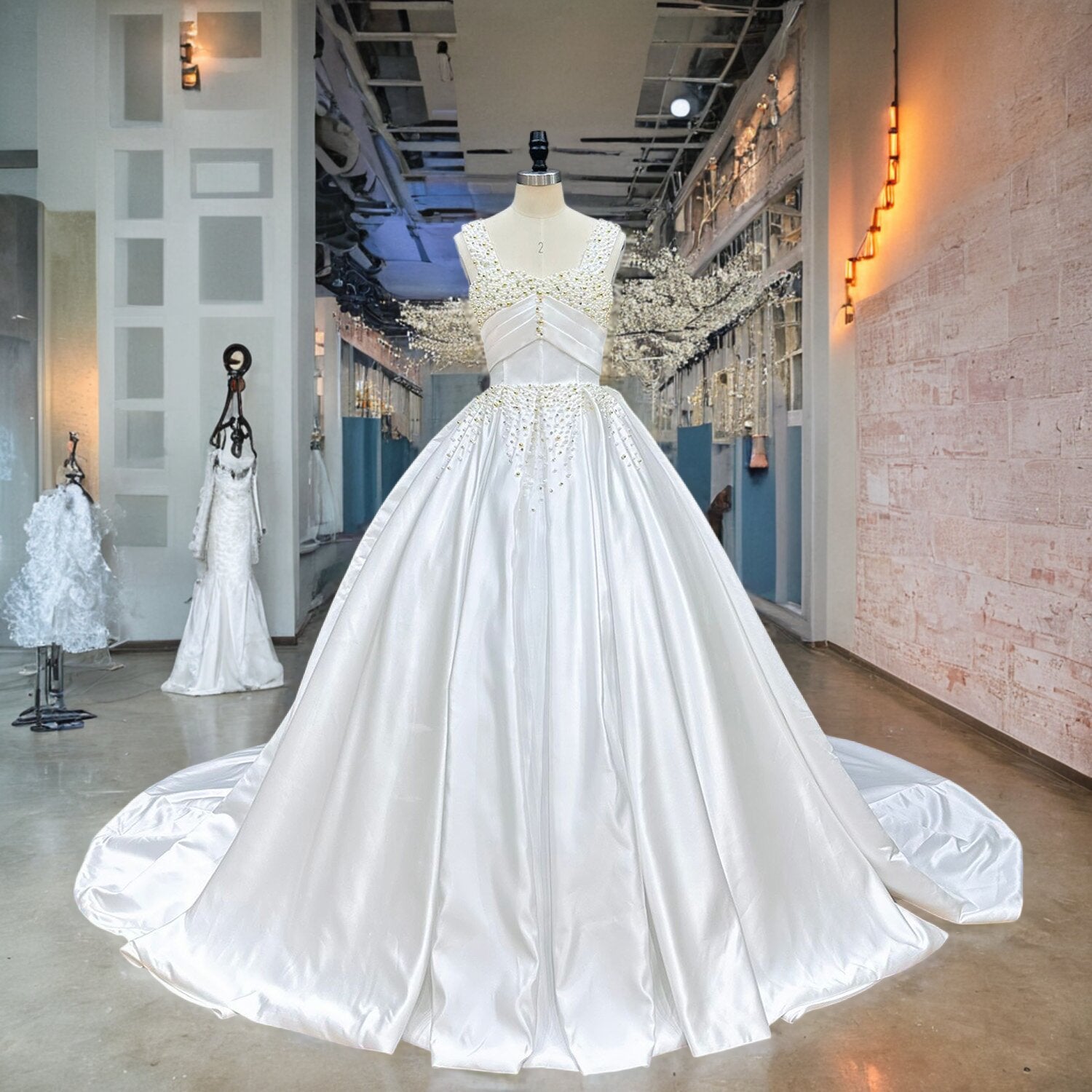 Radiate elegance with this Crystal Satin Ball Gown featuring sparkling crystals, detachable straps, and a flattering corset back. Its voluminous skirt and timeless design create a stunning silhouette perfect for your unforgettable wedding day.
