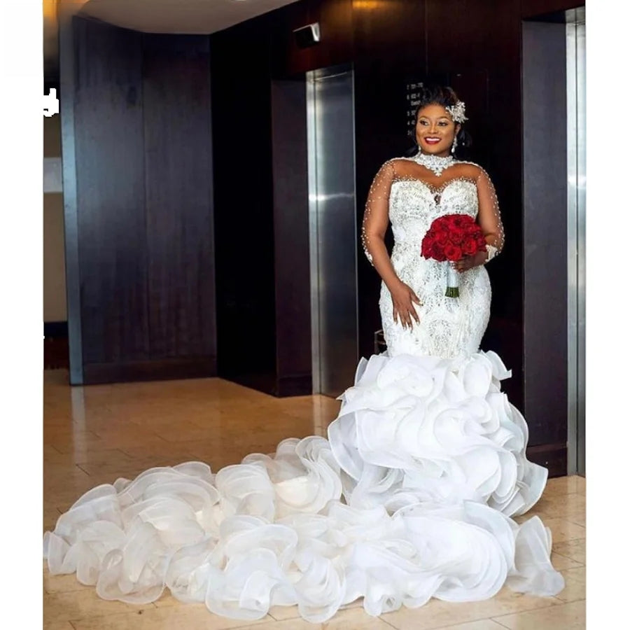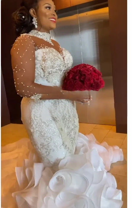 High Neck Beaded Ruffle Mermaid Wedding Dress Sleeveless Gown for African Brides