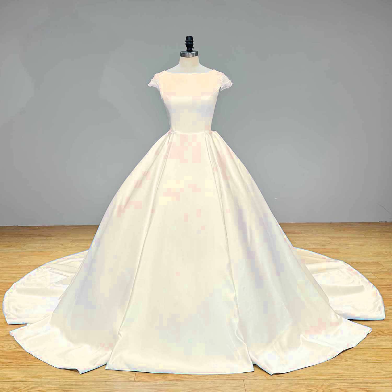 High Quality Satin Ball Gown Wedding Dress Cap Sleeves Illusion Back Bridal Gown