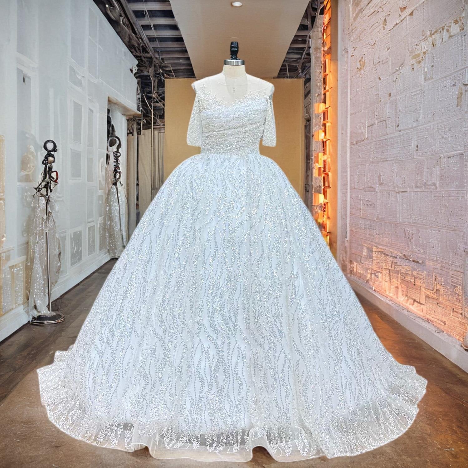The Hire Lnyer wedding dress features delicate pearls, shimmering sequins, and a flattering lace-up back for a timeless bridal look. Its voluminous ball gown silhouette ensures a dramatic and elegant entrance on your special day.