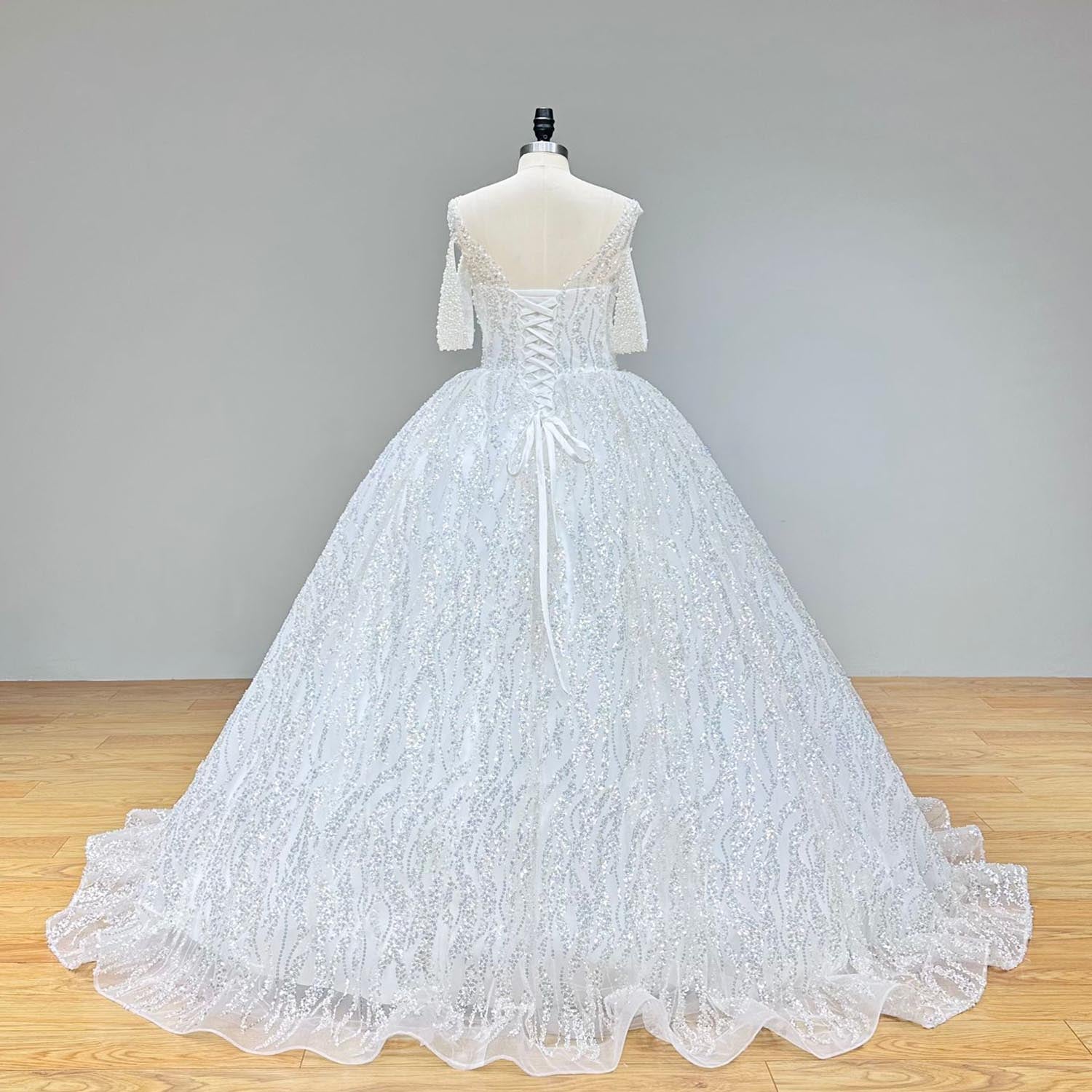 Hire Lnyer Short Sleeve Lace Up Back Beaded Pearls Sequin Ball Gown Wedding Dress
